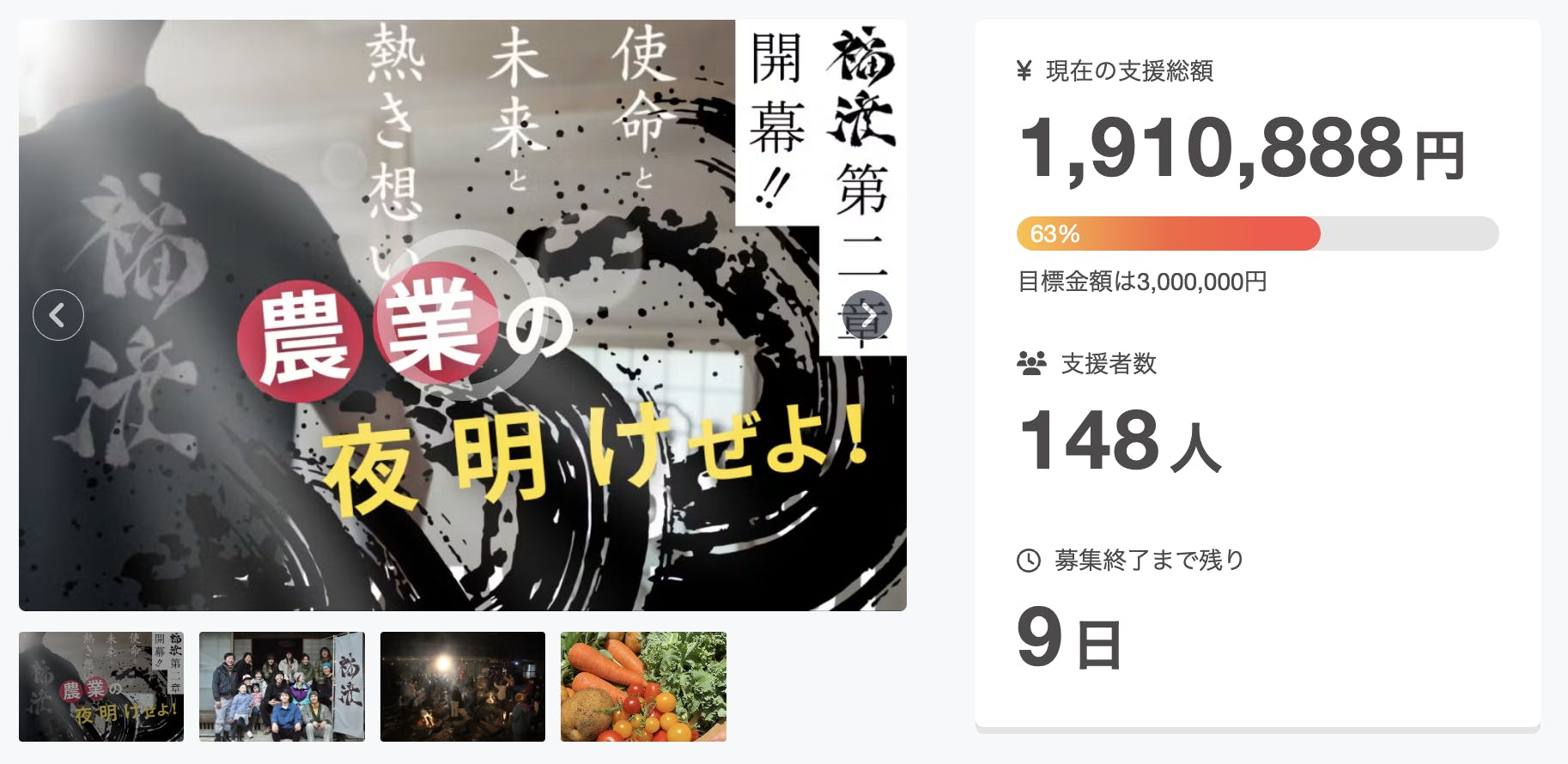皆さまのお力添えのおかげで、ついにご支援金額が200万円を突破しました!!この勢いで300万円の目標も達成します。プロジェクト期間はあと2日、4月30日23:59までです。プロジェクトの目標達成、そして日本を農業から変えていくビジョン達成のため、今一度お力をお貸しください!一緒に農業、そして日本の未来をより良い方向へと変えていきましょう!!農業の夜明けぜよ!!
