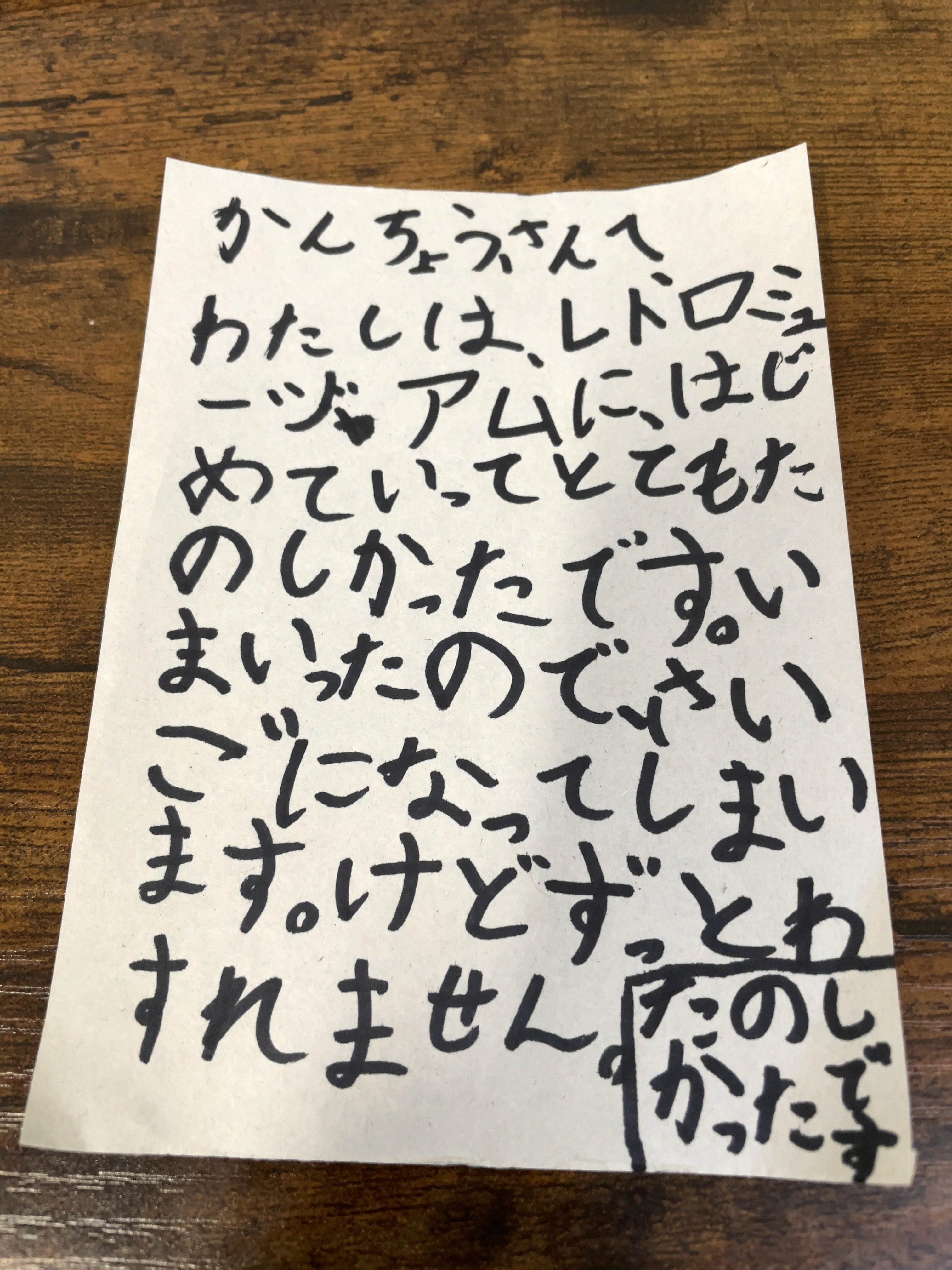 閉館が決まった後からは多くの子供たちが「館長さんへ」と自分で書いてくれた手紙を持参して遊びに来てくれました。この手紙を見た時に、「あぁぁ~もうこの子たちが遊べる施設は無くなるんだ」と思うと涙が止まりませんでした。私は事情があり子供がいません。まるで孫のような世代の子達からこのような手紙を直接貰うことが出来、出雲崎レトロミュージアムを作って良かった、そしてなんて自分は幸せなんだと実感することができました。