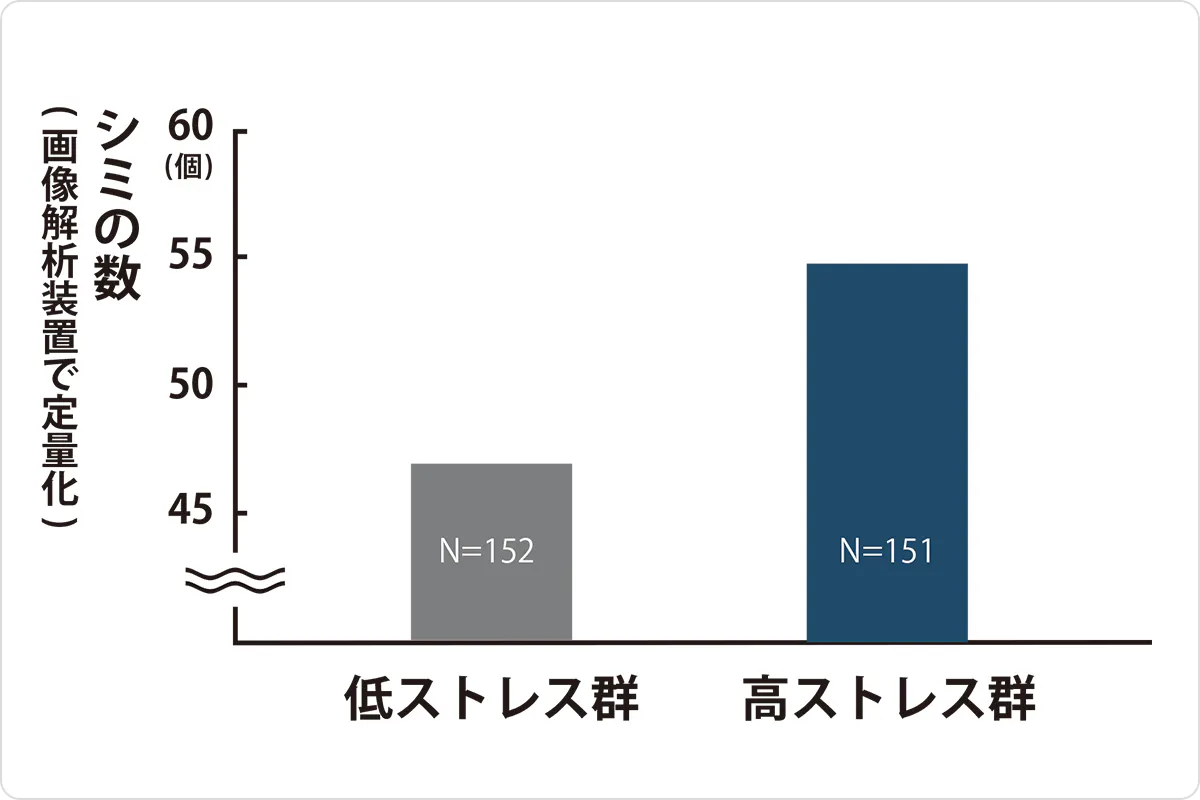 特にびっくりしたのが、ストレスホルモンが多い人の方が、シミの個数が多いということ。