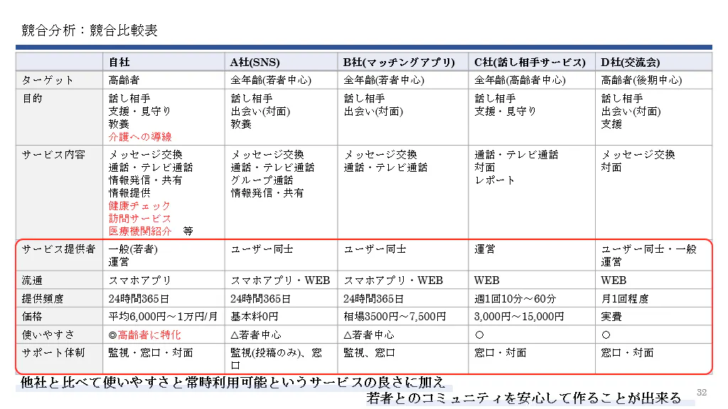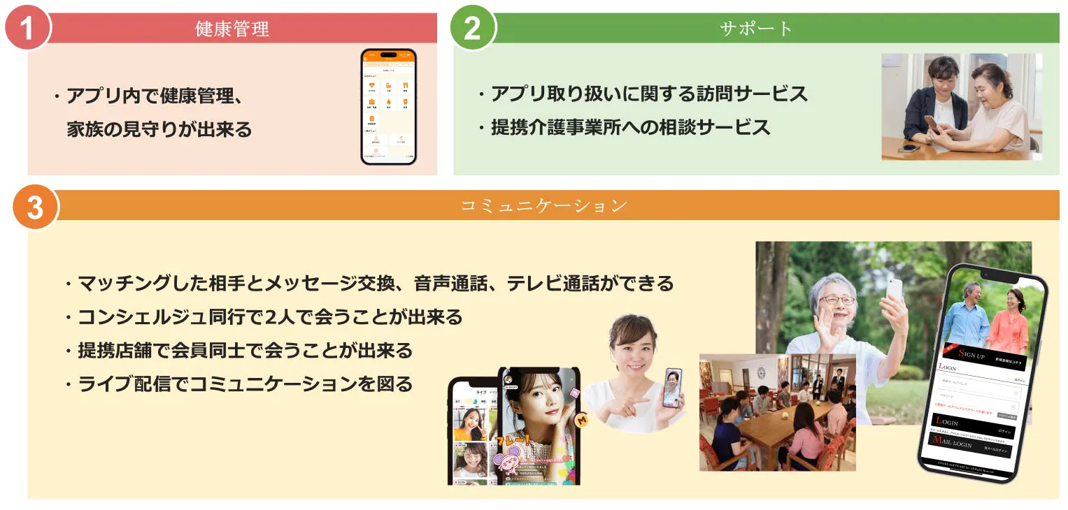アプリのコンセプトとしては、高齢者の為に特化したものにすることで、高齢者自身が使いやすく、わかりやすい仕様になっており、下記を中心に安全安心に高齢者の孤独感の緩和、幸福度の向上・維持を行います。