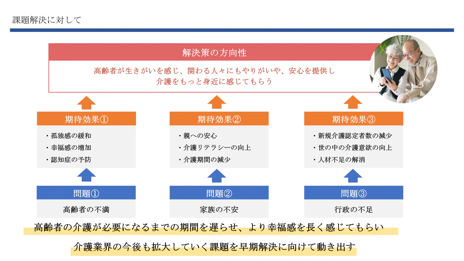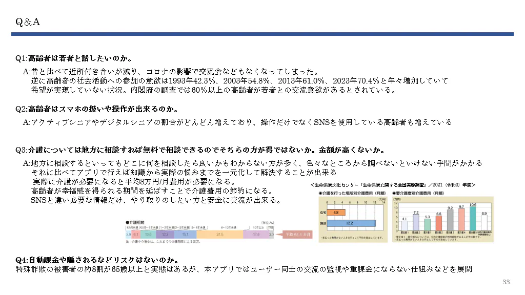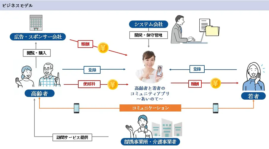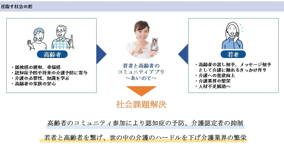 私たちの目標は、高齢者と若者をつなぐ高齢者の為のマッチングアプリを開発し、世代間の交流を活性化させることです。このアプリを通じて、高齢者が抱える孤独感や生活の不便さを解消し、家族の安心を提供します。また、若者には人生経験に基づく学びの機会を提供し世の中が介護を身近に感じる仕組みづくりをします。双方が互いに支え合うことで、より豊かで活気あるコミュニティの形成を実現したいと考えています。