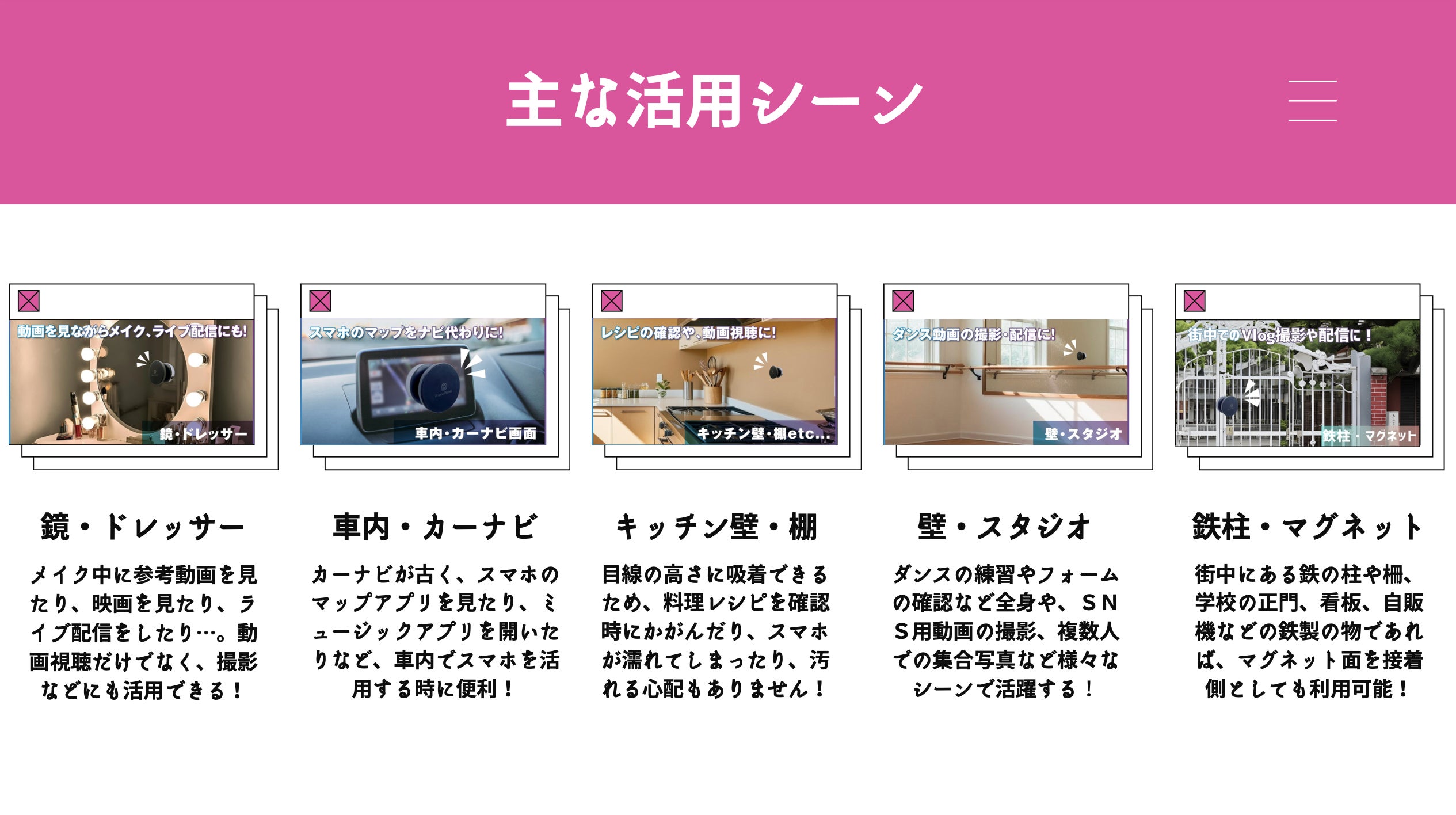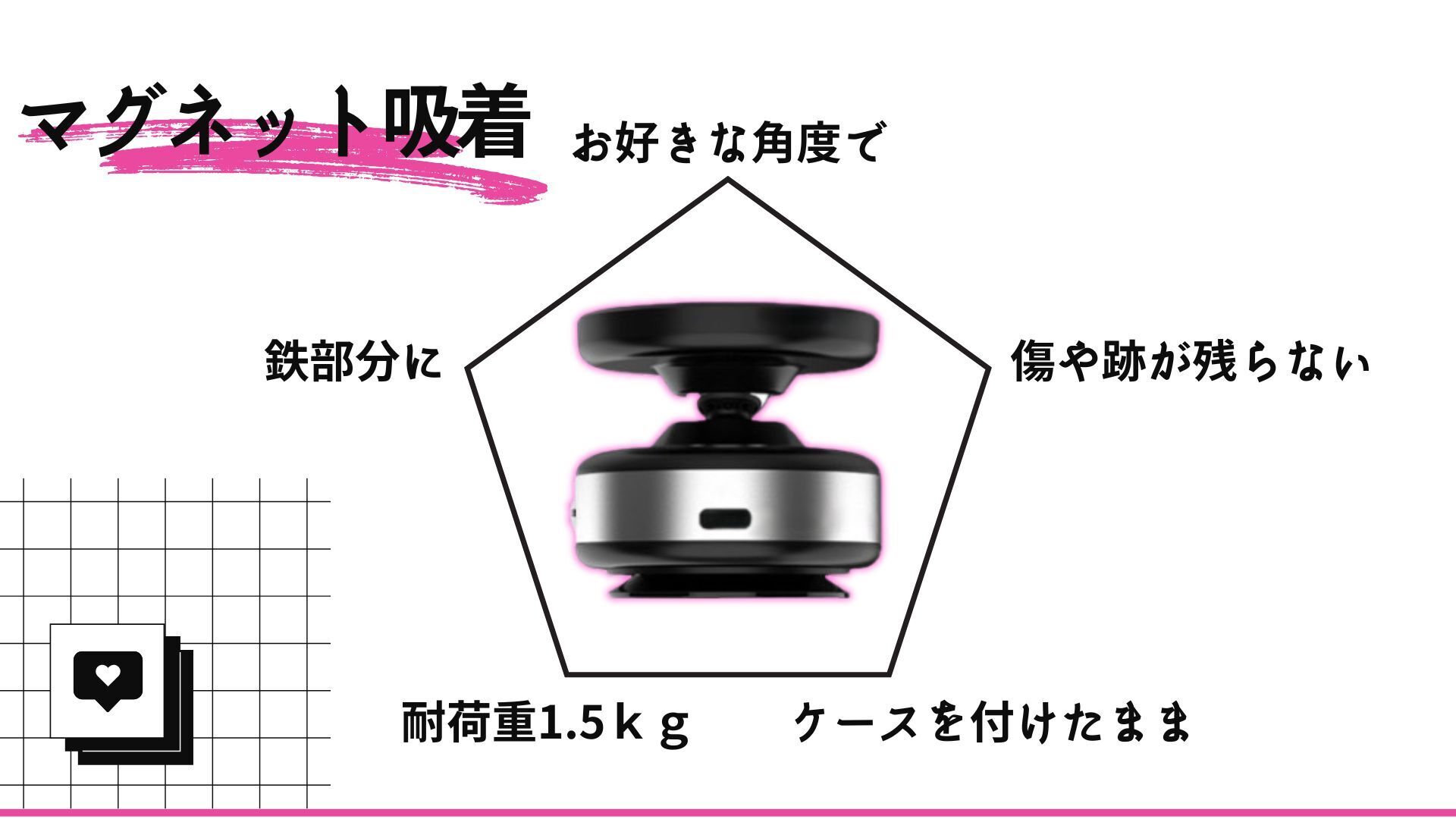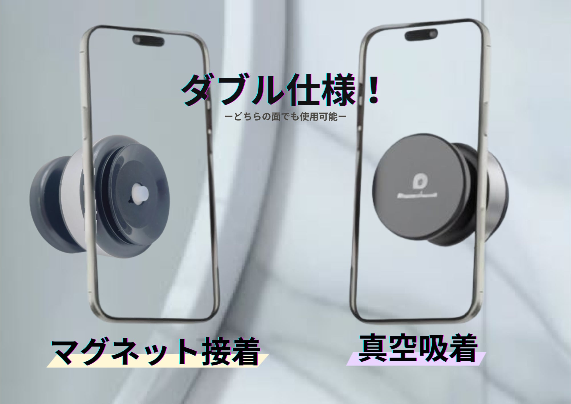 また、本製品はマグネット側でも使用できるため金属があればどこでも設置できるダブル仕様!外でのSNS撮影や動画視聴、車内ナビなど、あらゆるシーンで手軽にスマホを設置して快適に使用できるので、
