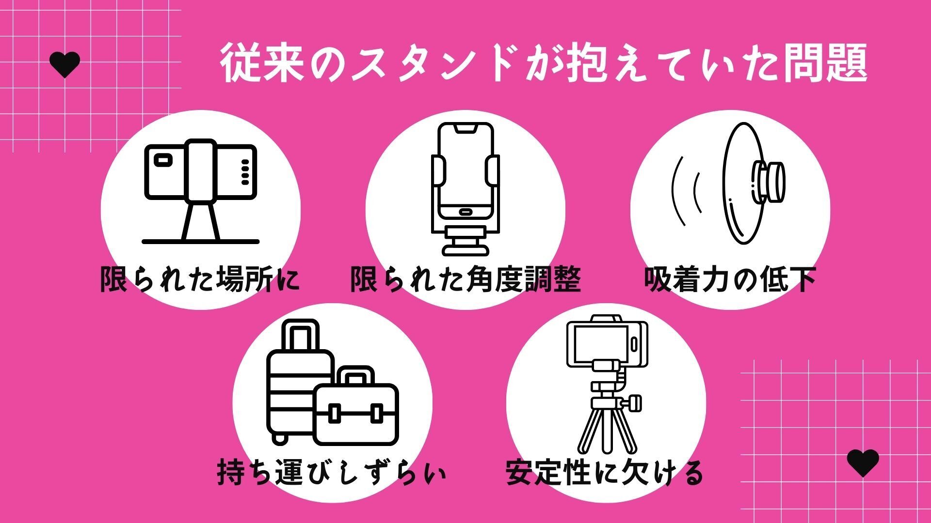例えば、テーブルや床に置くタイプのスタンドは限られた場所にしか設置できず、角度調整も限られた範囲で不便を感じることがありました。またマグネットタイプのスタンドでは、木製の壁やプラスチックの表面には使用ができなく金属製の平滑な面にしか吸着できないため、吸着場所が制限されたり、安定性がなくなることも…。