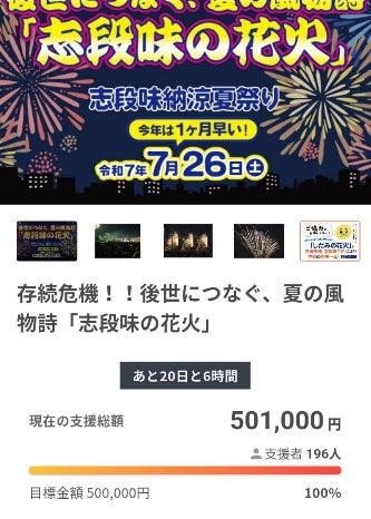 2025/06/12 13:59【クラファン100%達成!】皆さま、本当にありがとうございます!志段味の花火クラウドファンディング、目標金額50万円を、なんと残り20日を残して達成することができました!初めての試みであったこのクラウドファンディングが、こうして地元の皆さまに届き、支えられ、形となったこと。皆さまの「地元への愛」を、実行委員一同しみじみと感じています。温かいご支援・応援の声のひとつひとつが、大きな力になりました。本当にありがとうございます!そしてここからは、ネクストゴール「80万円」を目指します!+30万円で、花火をさらに500発追加!この夏の夜空を、もっと華やかに。このまちの笑顔を、もっと広げたい。引き続き、応援・ご支援・シェアのご協力をよろしくお願いいたします! もっと見る