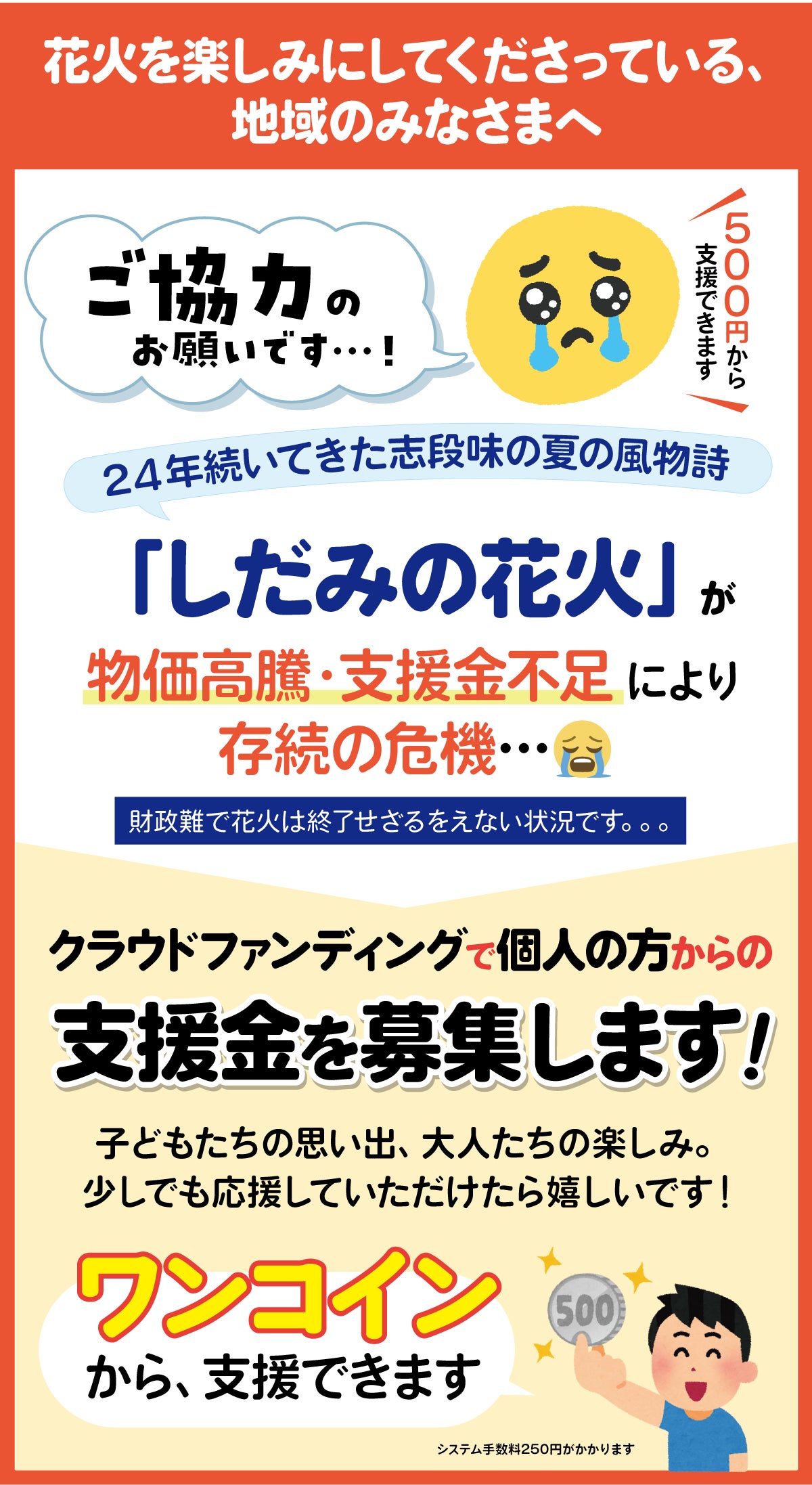 率直に言いますが、資金難で、今後、花火の打ち上げどころか、夏まつりの開催が危ぶまれます。