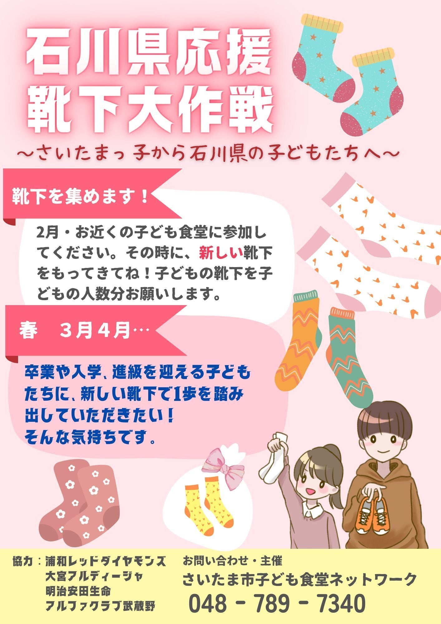 昨年1月に起きた能登地震の後、私たちサッカークラブにも何かできないか模索していた中、さいたま市子ども食堂さんからお声掛けいただき「靴下大作戦」に参加させていただきました。(その時はタオル1,000枚の寄付と仕分け作業のお手伝い)。