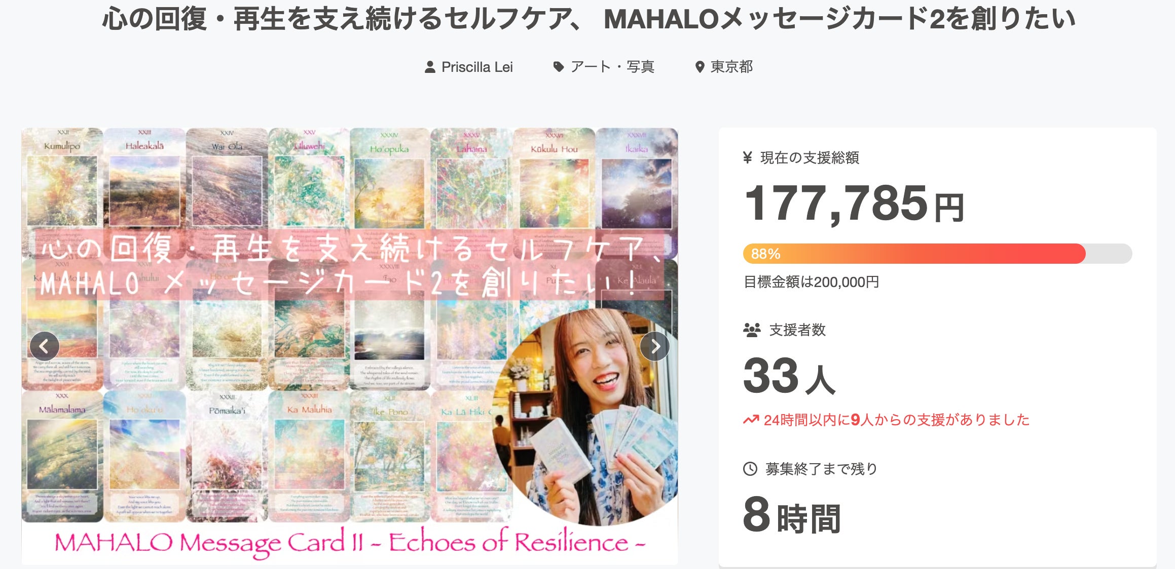 皆さん、こんにちは!アーティスト Priscilla Lei (プリちゃん)です!現在、3月29日(土) まで、個展『心に灯す光と色彩のパレット』を開催しています。ハワイ・マウイ島の光景から産まれたフォトアートたち。展示テーマは、【Echoes of Resilience (強さの残響)。】人は弱さを抱えながらも、乗り越えていく強さも持ち合わせている。。先月に行ったクラファンに応援してくださった方のお陰様で、ついに『MAHALOメッセージカード II ~ Echoes of Resilience ~』が無事に完成しました!!応援していただいた皆さんがいたから、【想いが現実】となりました!本当にありがとうございます!この新作カードは、前作の”今ある日常の彩りを、より増していく”ものとは違い、【私たちが生きていくなかで、「喪失から、再生まで」に体験する深い感情たちに対して、絵とメッセージ、ガイダンスPDFで寄り添いサポートする22枚。】これから先々で、、このカードたちに出会う人の心が、どんなときでも、少しずつでも穏やかな状態になる一助となれたら。。本当に本当に、嬉しく思います。*カードの発送作業にも移りましたので、オーダーいただいた方は、ご到着を今しばらくお待ちくださいね。。!※最終日3/29までは、【通常の個展】として開催しています。【基本的に毎日在廊する予定】なので、ぜひ一人でも多くの方に足を運んでいただけましたら嬉しく思います。★月曜日はお店そのものがお休みなので、ご注意くださいませ★ ✴︎⋆.* ✴︎⋆.* ✴︎⋆.*Priscilla Lei 個展『心に灯す光と色彩のパレット』【会期】3月15日(土)〜3月29日(土)★月曜日は、ギャラリーがお休みです★【オープン時間帯】火曜日〜金曜日: 11:00-18:00土日祝: 12:00-19:00【作家在廊について】“基本、毎日在廊”しています。ぜひ会いにいらしてくださいね。▶︎変更がありましたら、インスタストーリーでシェアします。【会場】Shelter KUKO cafe & gallery@shelter_kuko ✴︎⋆.* ✴︎⋆.* ✴︎⋆.*