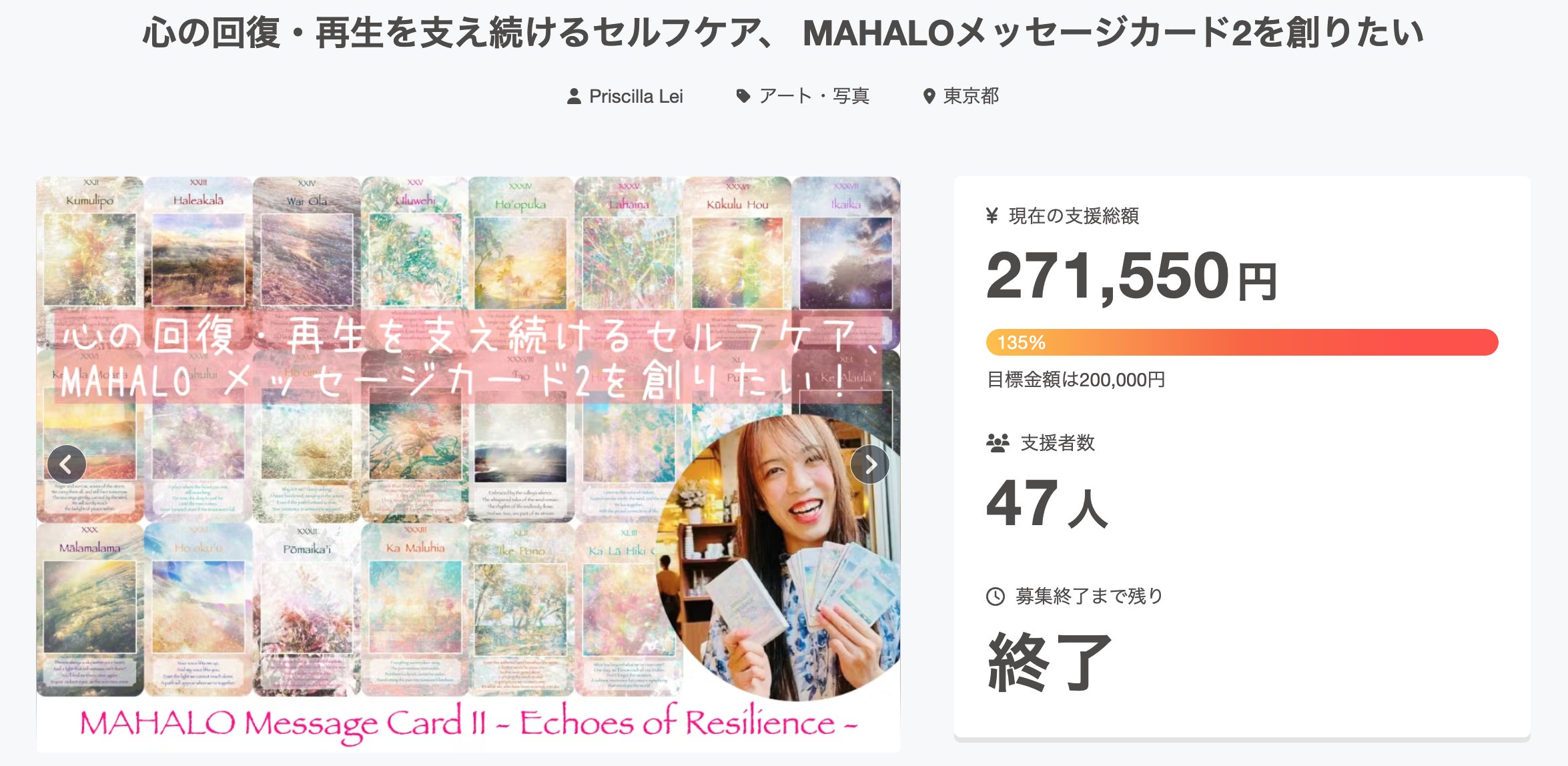 皆さん、こんにちは!アーティスト Priscilla Lei (プリちゃん)です。先日、無事にクラファンを終えましたが、お陰様で最終着地は、【135%】となりました。本当にありがとうございます。。!