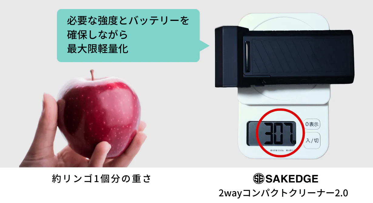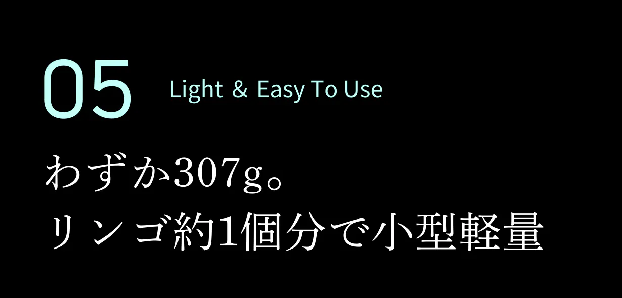 必要な強度とバッテリーを確保しながら最大限軽量化させた小さなボディは何と307gと約りんご1個分。持ち運びにも最適です。