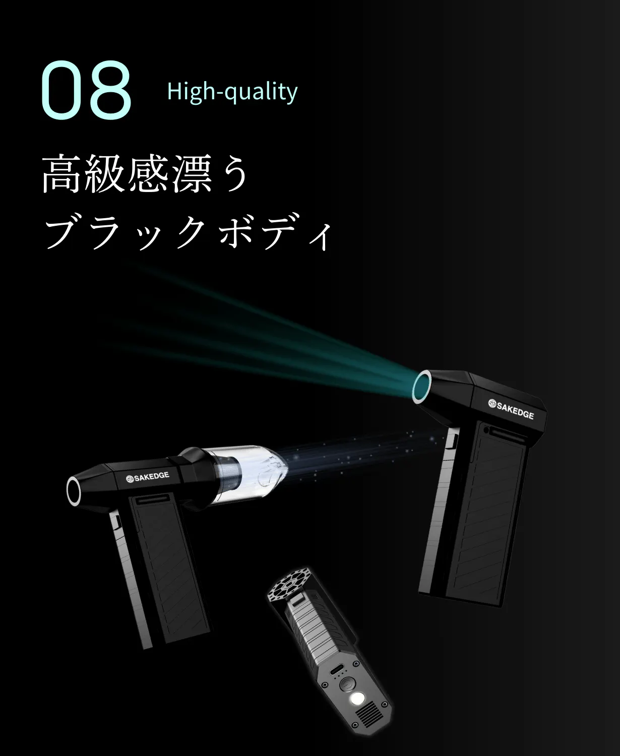 SAKEDGE 2wayコンパクトクリーナー2.0は上品なブラックを基調とし、手に持ちやすいデザイン。シンプルでありながら洗練されたデザインが、高級感を漂わせ、どんなシーンにも自然に溶け込む美しい仕上がりになっています。