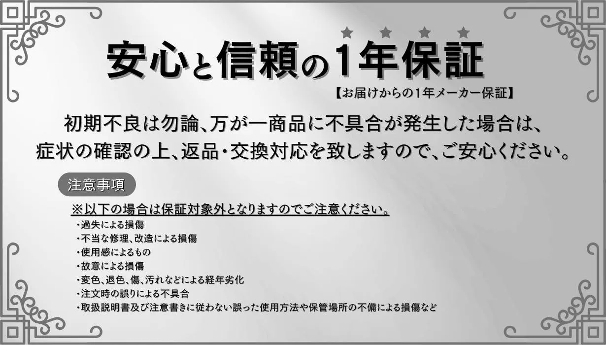 お客様に安心してお使いいただけるアフターサポートもお任せください。商品お届けから1年間保証をご提供いたします。正常な使用方法(※)のもとで万が一発生した故障については、保証期間内であれば無償で修理いたします。保証期間を過ぎた場合につきましては有償となりますが、可能な限り修理等のご対応をさせて頂きますので、お気軽にお問い合わせ下さい。