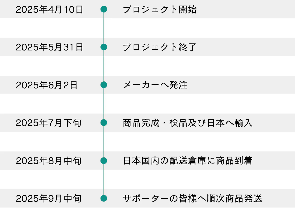 ※本文中に記載させていただいたスケジュールは、あくまでプロジェクト公開時点の予定です。クラウドファンディングの性質上、配送遅延のおそれがございます。原則として、配送遅延に伴うご支援のキャンセルはできませんが、リターン配送予定月から6ヶ月を超えた場合には、希望者に限りキャンセルにて対応させていただきます。