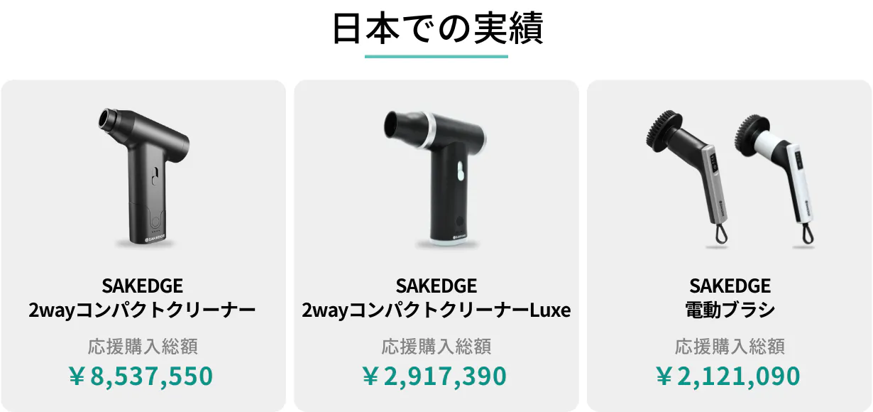 2024年4月に初となる先行予約プロジェクトを開始して以来、多くの皆様にご支持いただいております。初代SAKEDGE 2wayコンパクトクリーナーでは8,537,550円、SAKEDGE 2wayコンパクトクリーナーLuxeでは2,917,390円、SAKEDGE電動ブラシでは2,121,090円という金額を集め、累計で1,350万円超という支持を得ております。