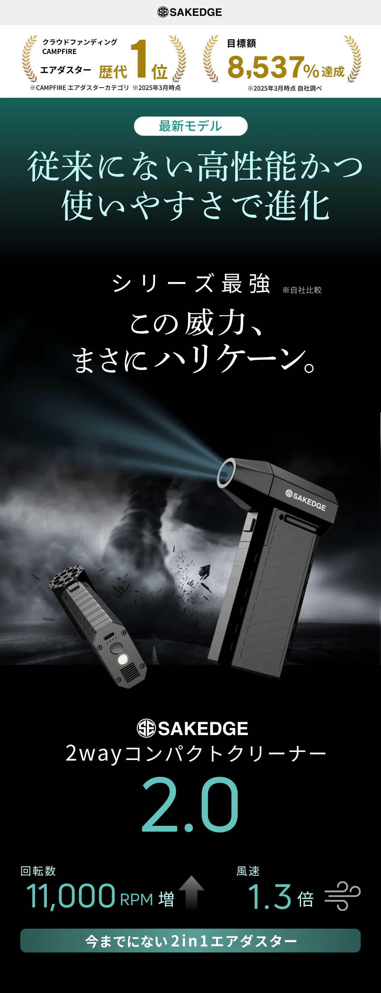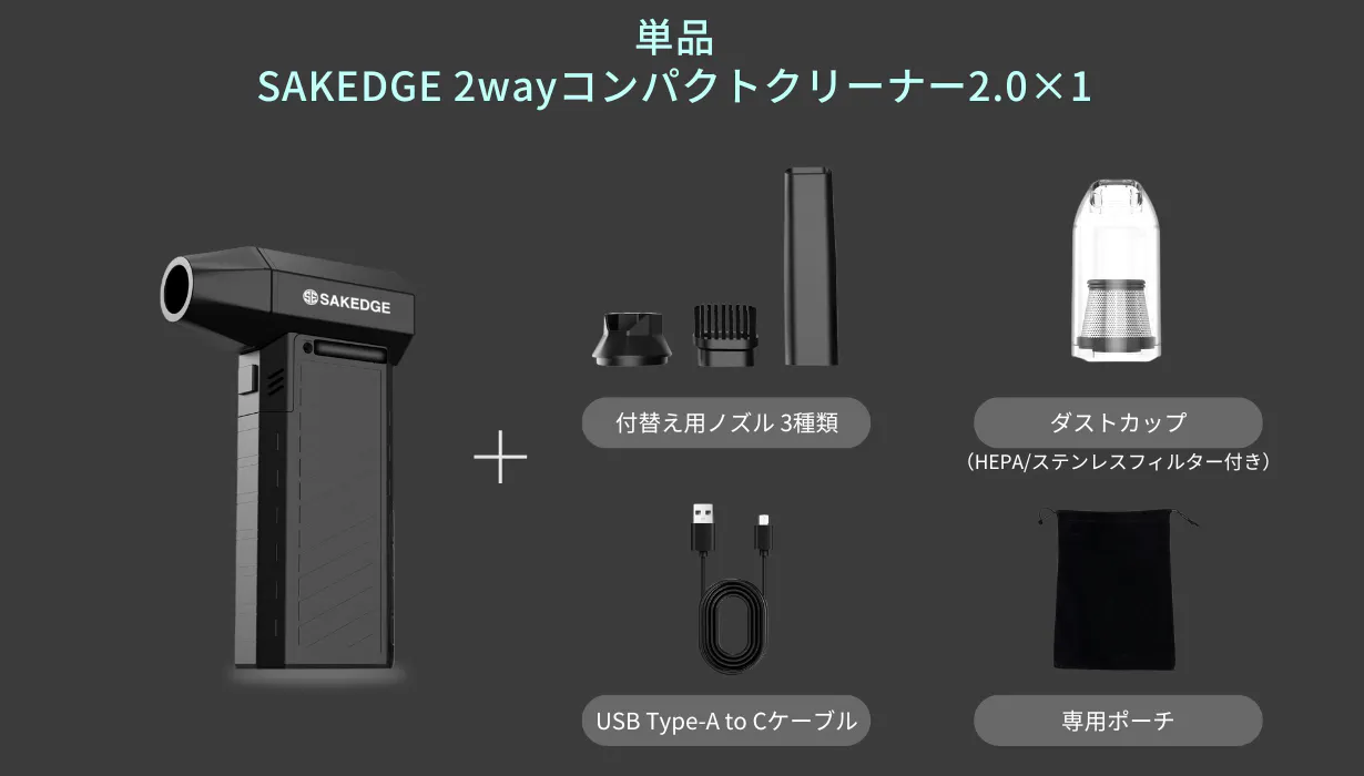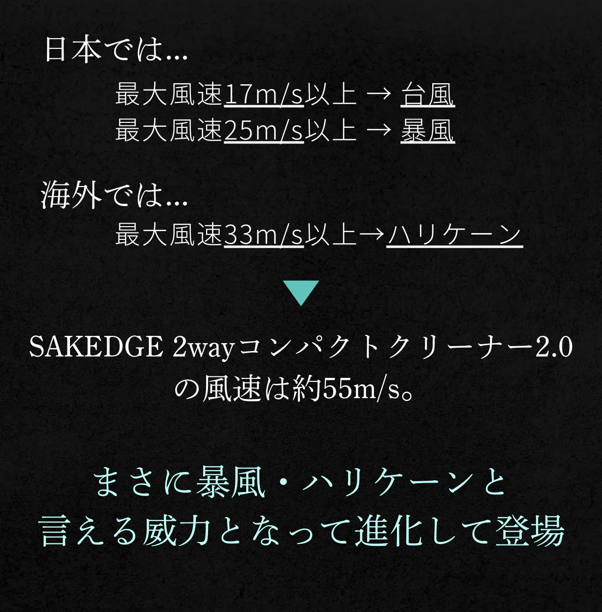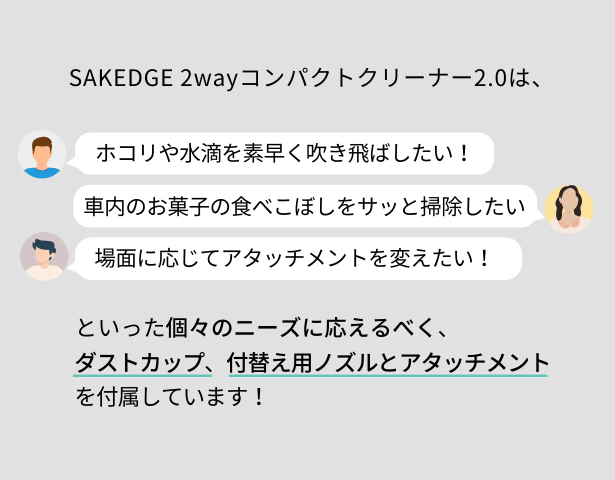 「SAKEDGE 2wayコンパクトクリーナー2」は、お家や車内の細かい掃除、洗車後の水滴飛ばしなどが簡単に出来る製品を探し求め作り上げた製品で、これが第3弾目となります。