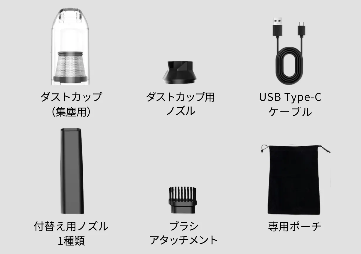 同梱物:付替用ノズル3種類・ダストカップ(HEPA/ステンレスフィルター付き)・USB Type-A to Cケーブル1本・専用ポーチ