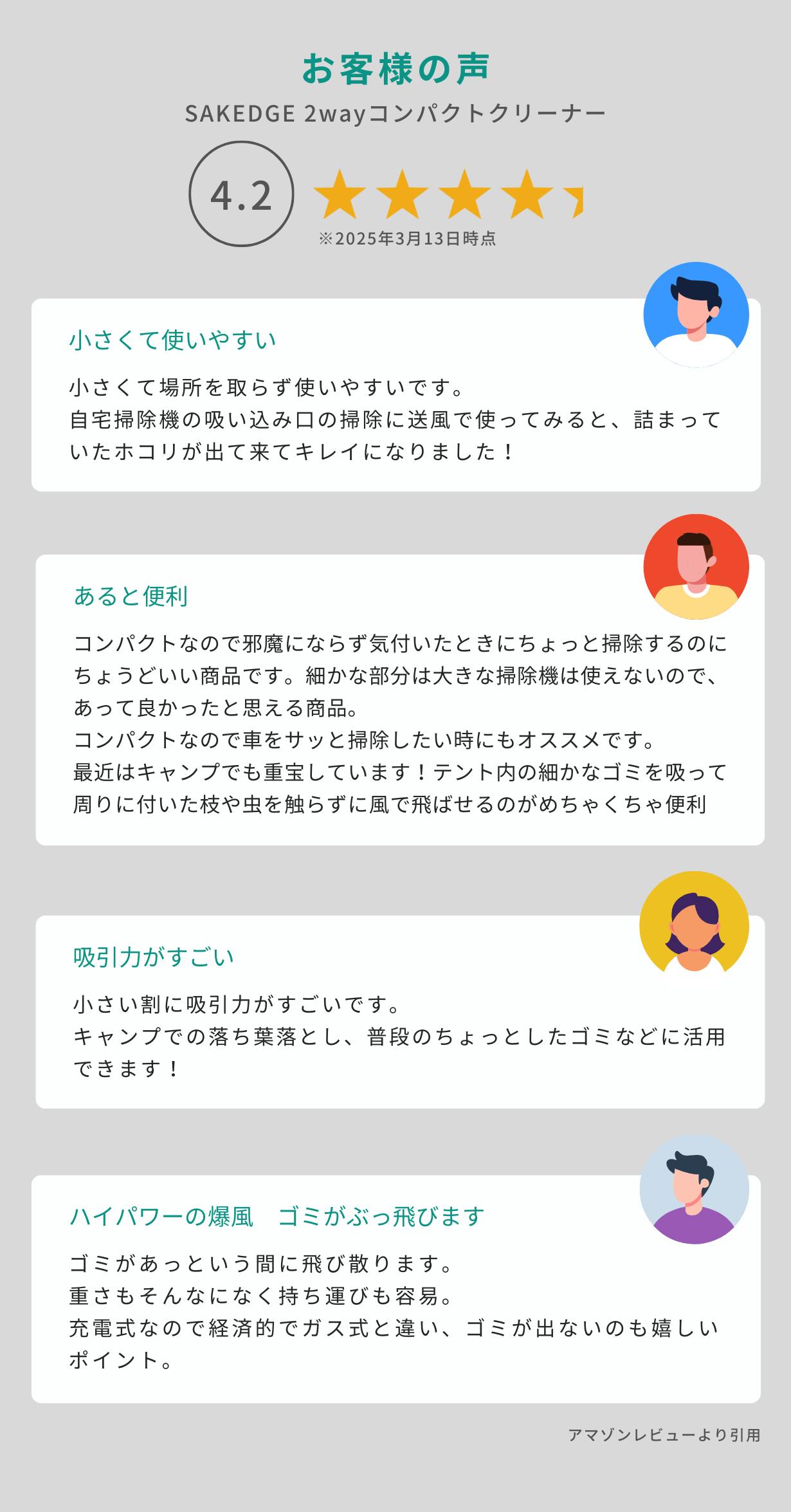 「SAKEDGE 2wayコンパクトクリーナー」は、どこにでも持ち運んで使用可能な、まさに相棒のような製品だと思っております。
