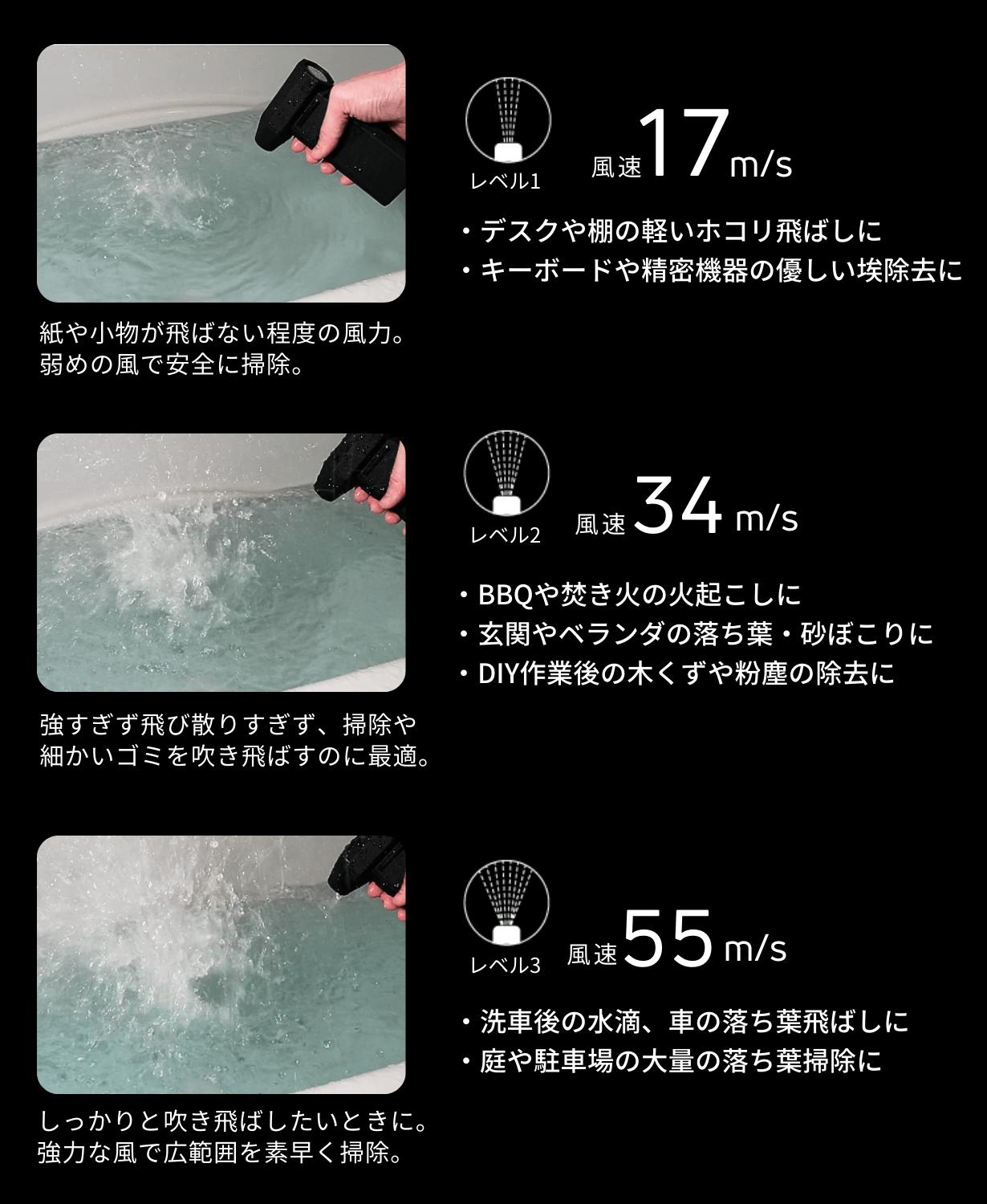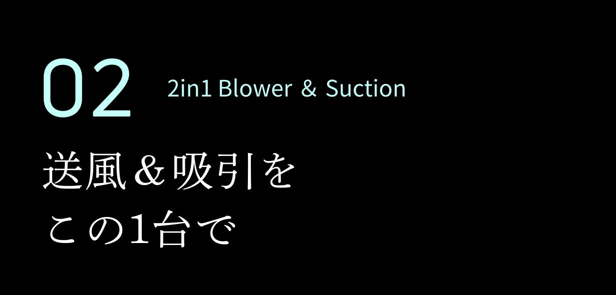 本商品は、送風と吸引の2way仕様でありながらも、131,000RPM(回転数/分)&最大風速55m/sの高性能モーターを持ち、更に電源を繋ぐことなくポータブルに使うことができ、あらゆる場面で活躍する1台多役の非常に便利なプロダクトです。