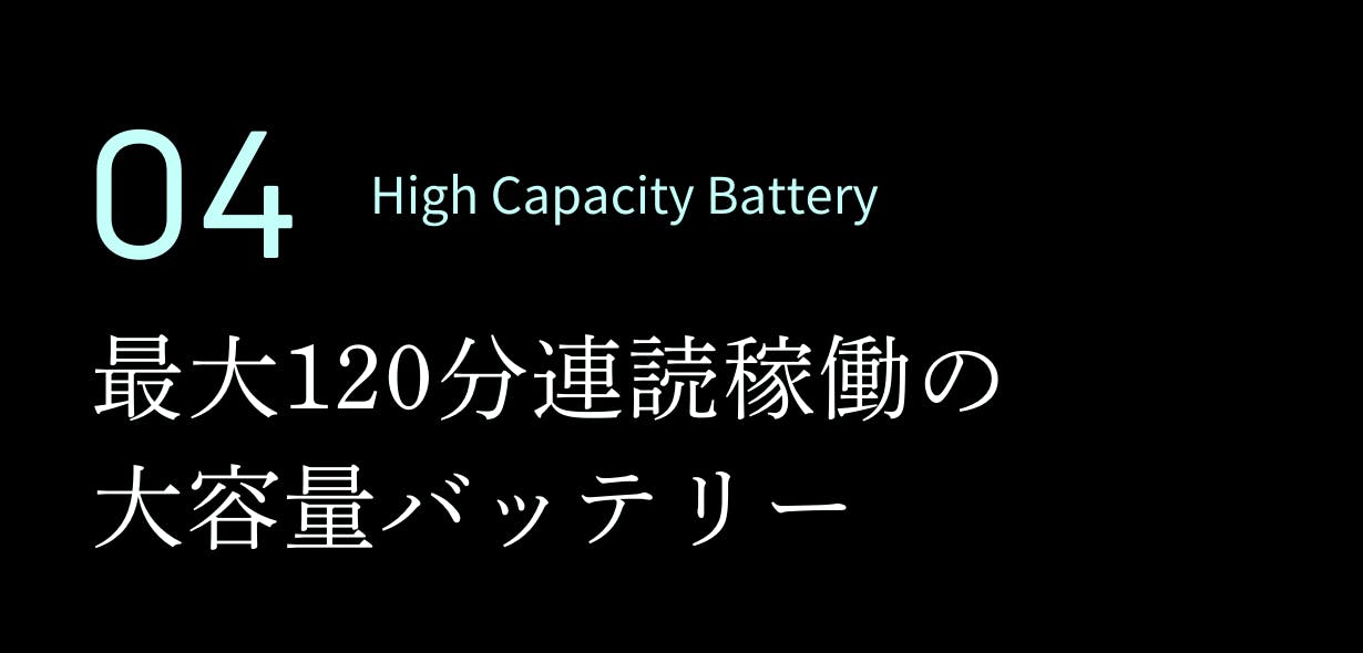 6000mAhのバッテリーを搭載しており、最大120分連続稼働が可能です。