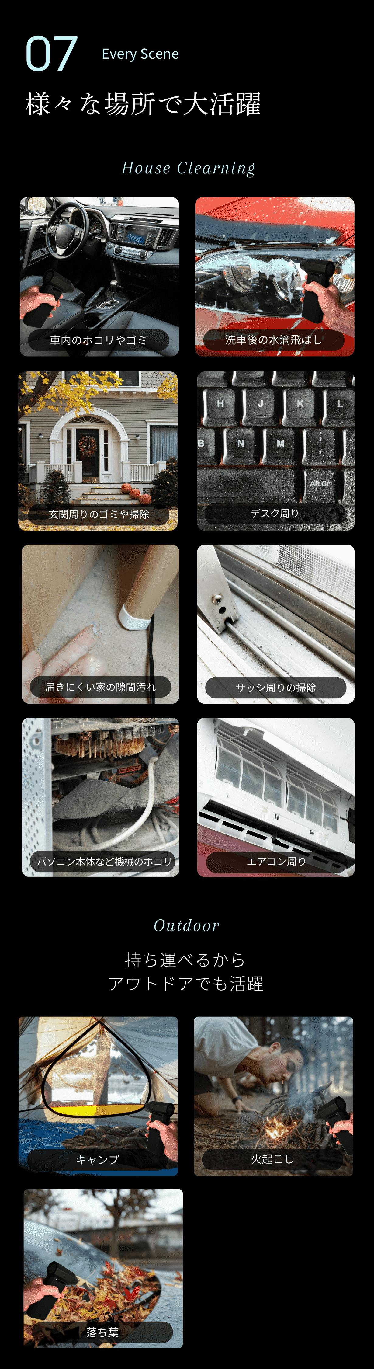 私自身、デスクの掃除やカメラのホコリ取り・車内の全体の掃除に洗車後の水滴を吹き飛ばしたりとかなりのヘビーユーザーです。