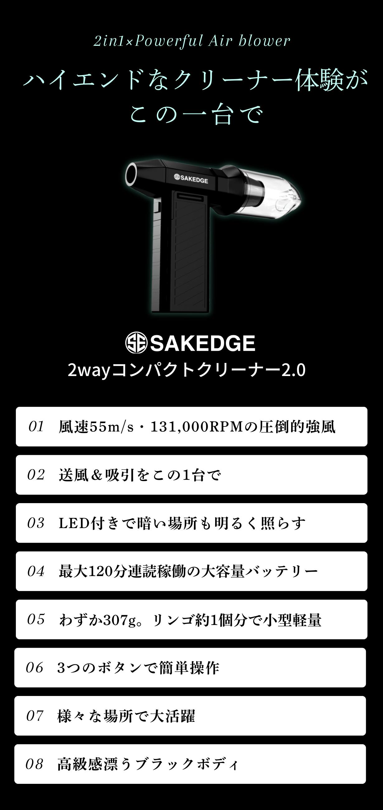 SAKEDGE2wayコンパクトクリーナーの後継モデルのSAKEDGE2wayコンパクトクリーナー2.0は新機能の上部と下部にLEDライト付き。暗いところでもしっかり送風・吸引!