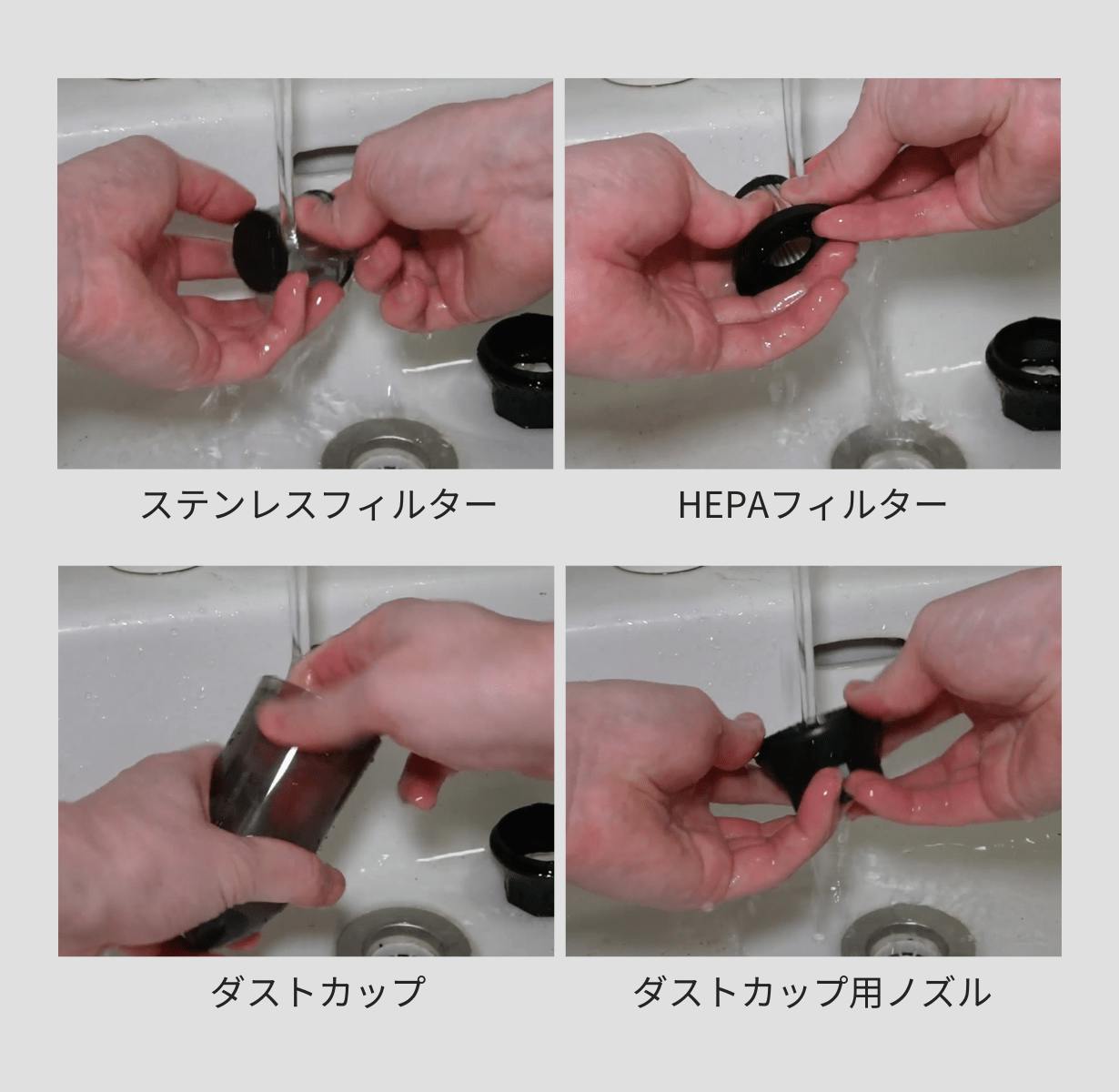 集塵用のダストカップはHEPA&ステンレスのフィルターで丸洗いが可能。
