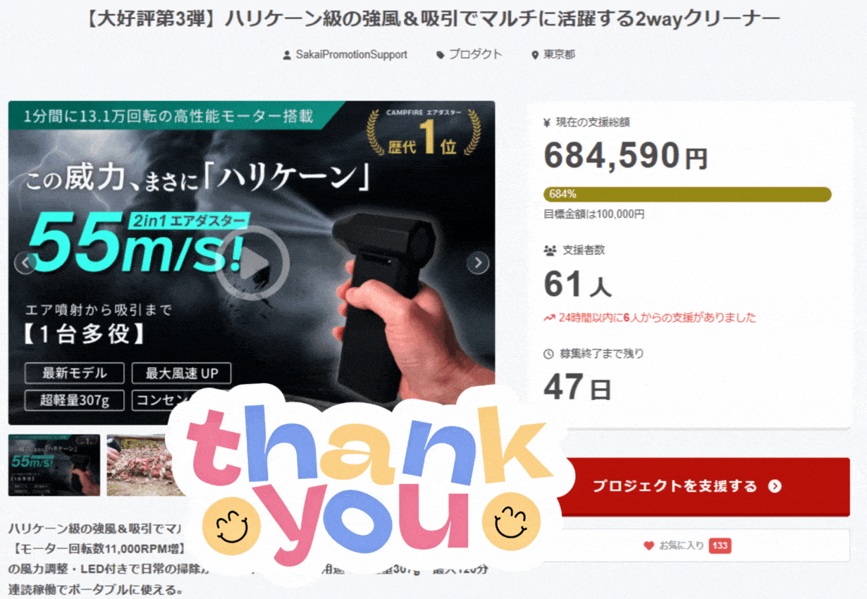 皆様の温かいご支援のおかげで支援総額60万円突破&SAKEDGE 2wayコンパクトクリーナー2.0「最速割」完売を達成することができました!
