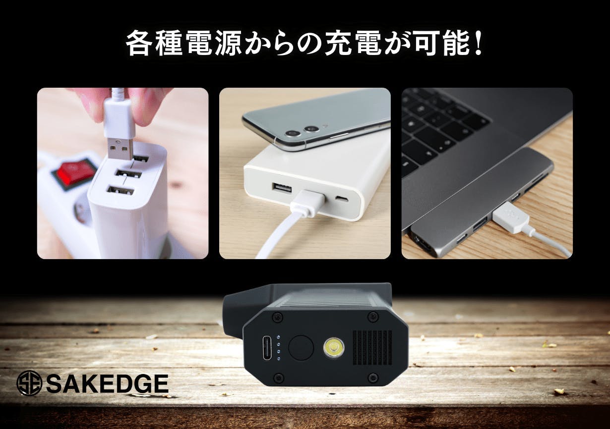 因みに出力最大の場合は約10分ほどの連続稼働時間となります。また中~低出力での稼働であれば更に長時間の作業が可能になりますし、いざという時はACアダプターやモバイルバッテリーからの充電で何度でも復活します!