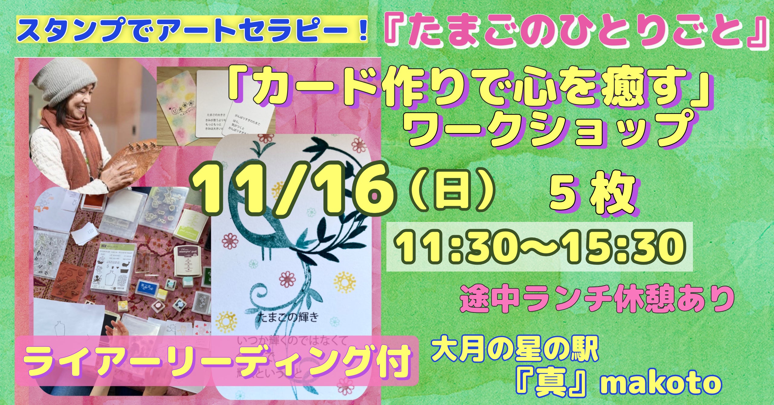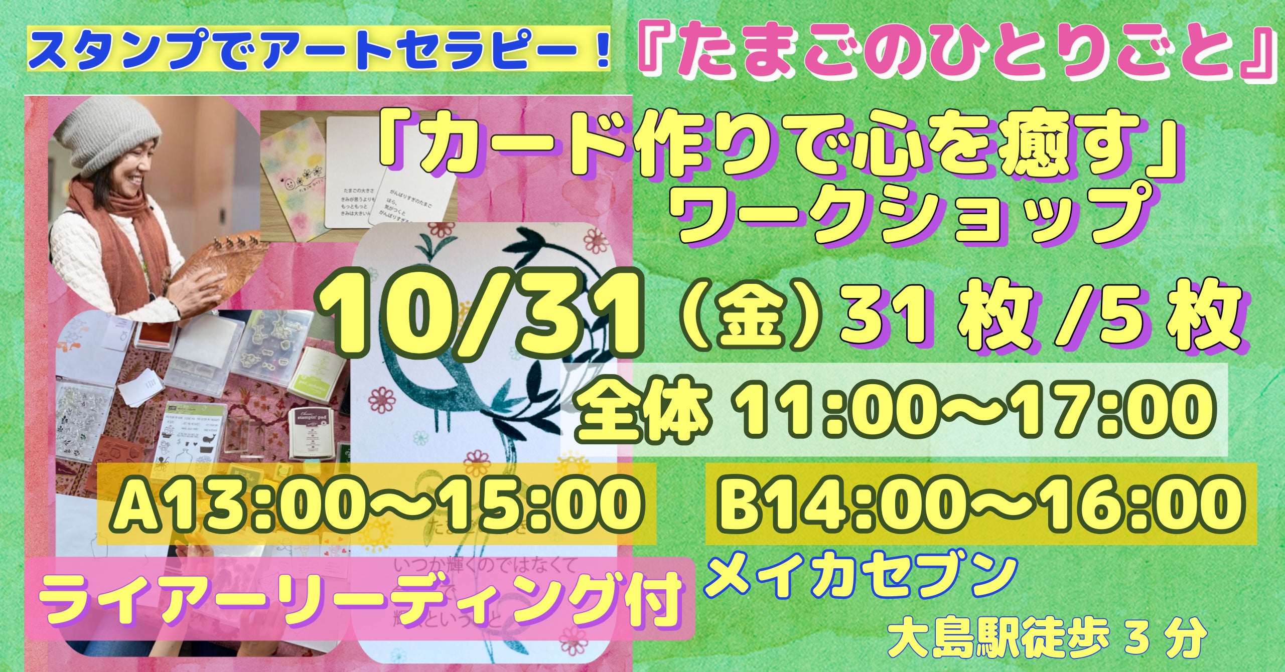 こんにちは、宝木美穂です。いつも温かく応援してくださり、本当にありがとうございます。 スタンプでアートセラピー!『たまごのひとりごと』カード作りで心を癒すワークショップ(31枚/5枚)@メイカセブン の開催日が決まりましたので、お知らせします。〇日時:12月16日(火)11:00~17:00※6時間で1日かけて作ることも可能です。※この時間内、飛び入りで1枚参加も可能!※2時間で作る方は、A(11:00~13:00)B(14:00~16:00)C(その他希望時間)〇会場:メイカセブン(都営新宿線・大島駅から徒歩3分)〇内容:「たまごのひとりごとカード」を200種類以上のスタンプと40色以上のインクで作っていきます!〇特典:完成カードから1枚選んでライアーリーディング♪野生のロイボスティーと店長厳選お菓子カードを入れるビニール袋(そのままお財布に入れてね)◆カード持参の方は、割引になります。ぜひ、この機会にカードを完成してください♪【詳細&申込はコチラ】※クラファンで【対面チケット】をご支援くださった方は、この日にご参加いただけます。(お問い合わせにその旨お書きください)◆前回の様子パンの香ばしい匂いに包まれた、優しい空間でのワークでした。本当に素敵なカードができましたよ~今回も、ほっこりした時間をお届けできれば嬉しいです。◆メイカセブンについて地元に愛されている老舗のパン屋さんで、焼き立てパンの香りが広がる、とてもあたたかい場所です。セットの野生のロイボスティーとお菓子。(この日はハロウィンで特別でした!いつも美味しいクッキーが付きますよ)ワークと合わせて、ぜひパンもランチも楽しんでいってください。この日、私が食べたビーフシチューカレーのナンもとっても美味しいですよ♪======次回予告26年1月15日(木)13:00~15:00@books & place Lamp(日野市、クレアホーム&ガーデン2階)応援してくださった皆さまのおかげで、こうしてワークを続けることができています。本当にありがとうございます。当日、皆さまとお会いできるのを楽しみにしています。宝木美穂