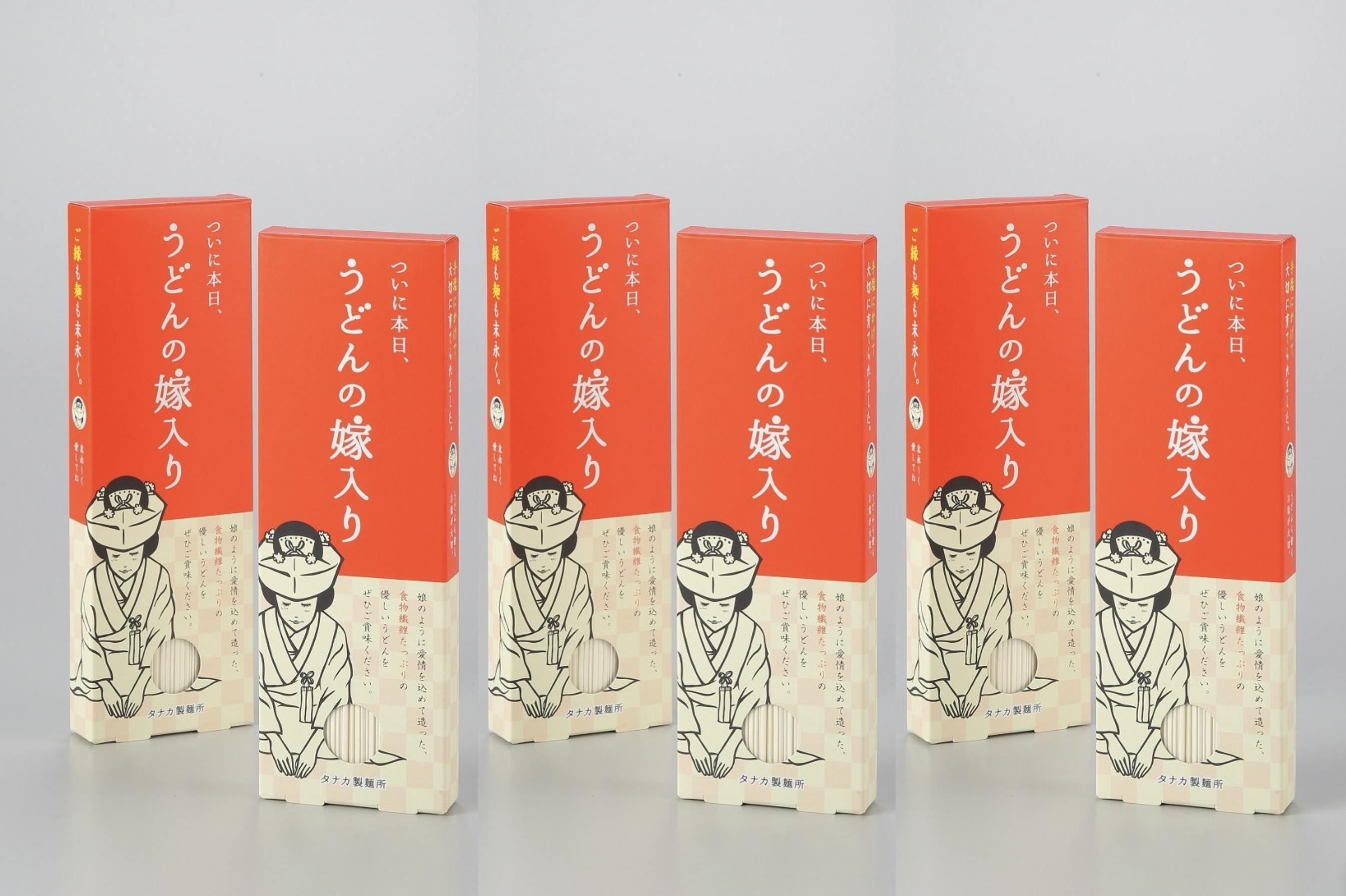大変苦労して、我が子のように開発してきた商品のため、商品名を『ついに本日、うどんの嫁入り』と名付け、パッケージには嫁入り衣装を着た女性のデザインにしました。