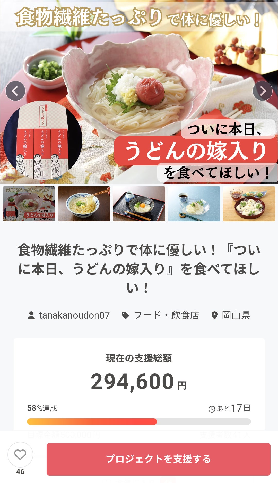 タナカ製麵所『ついに本日、うどんの嫁入り』を食べてほしい!クラウドファンディングにご支援いただき、本当にありがとうございます。昨日返礼品は、無事皆様のお手元にお届け出来たようです。皆さまへの感謝の気持ちが返礼品のうどんを通じて少しでも伝わると嬉しいです!今回のプロジェクトでは、たくさんの応援やあたたかいお声をいただき、私たちの作るうどんに対する皆さまの期待や想いを改めて感じることができました。いただいたメッセージやご意見を励みに、これからもっと美味しいうどんをお届けできるよう頑張ってまいります。ぜひ引き続き見守っていただけたら嬉しいです。改めて、今回のプロジェクトにご支援いただきありがとうございました! タナカ製麵所 代表 田中茂