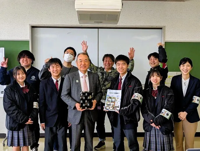 八女農業高校のパンフレットと、学生が作ったお菓子をお渡しして記念写真!