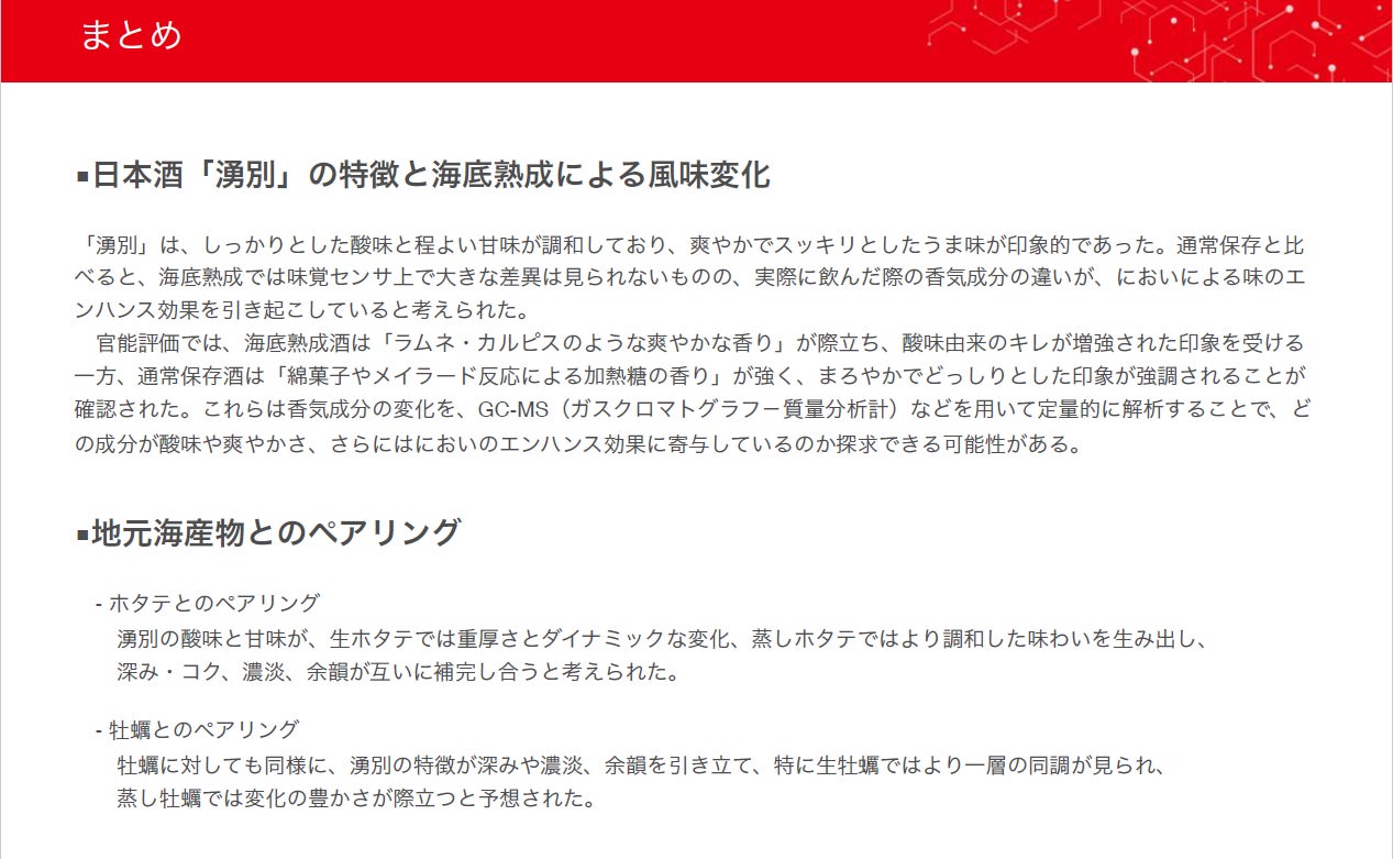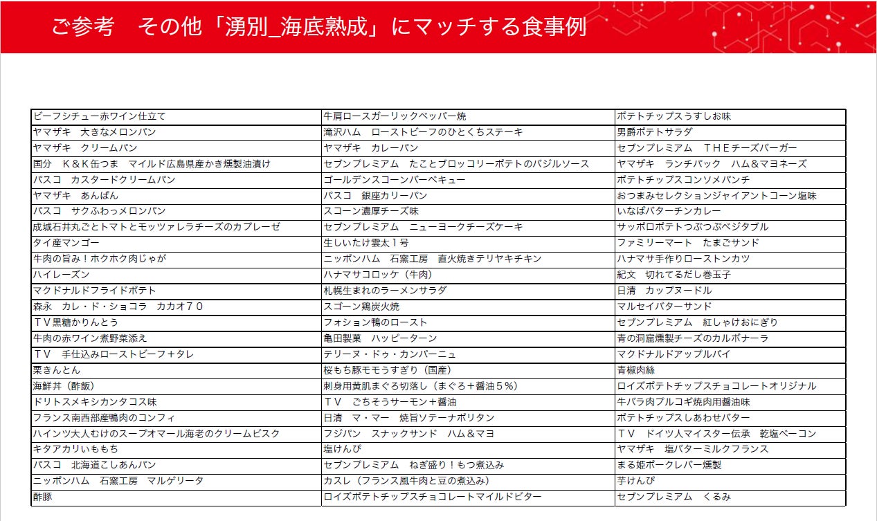 最後に海洋熟成、日本酒「湧別」に合う食事例です。