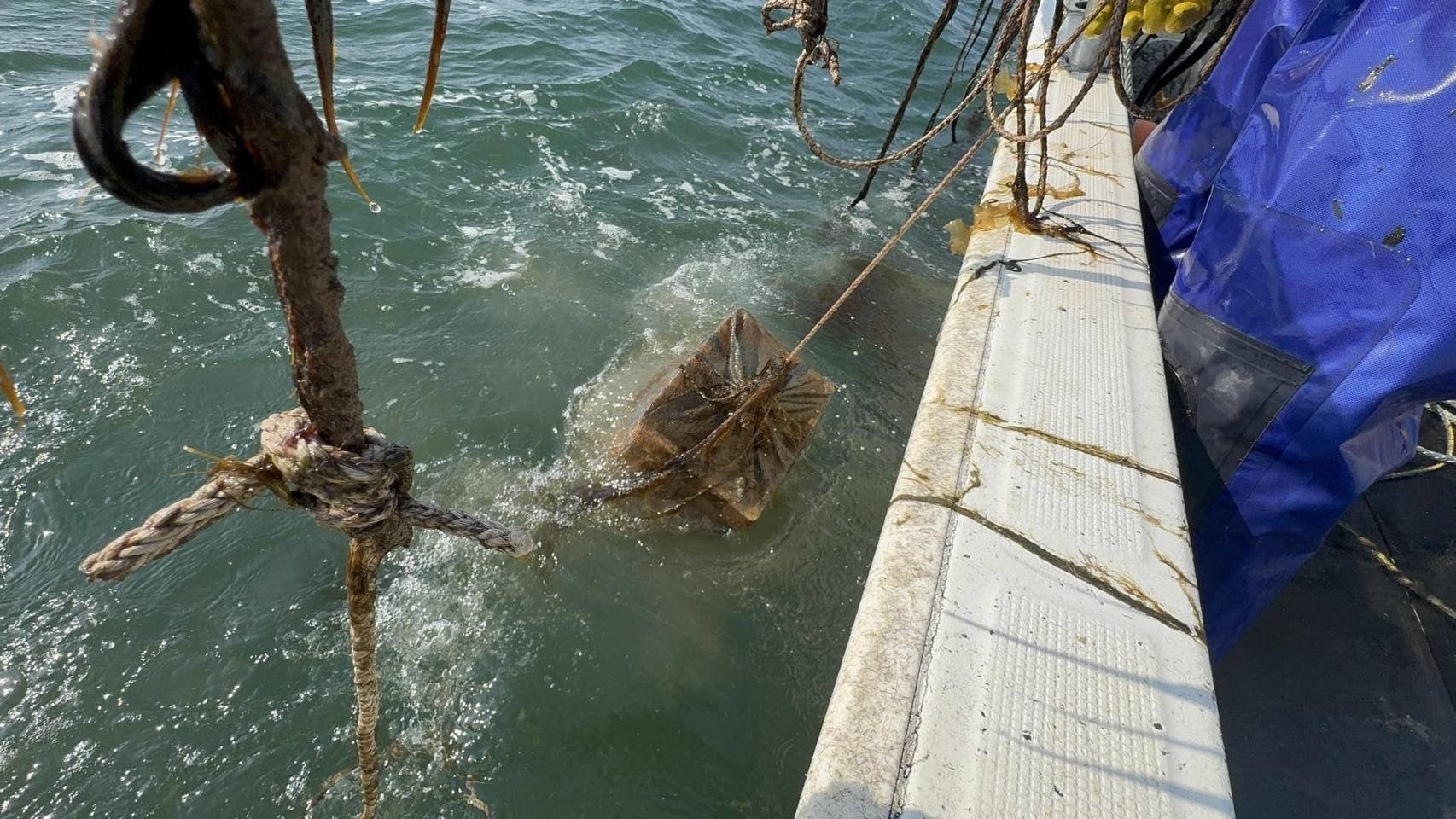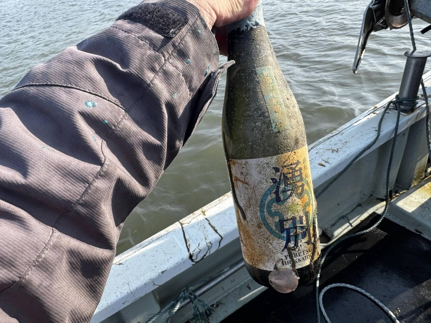 先日のテイスティング会で試飲しました日本酒を朝一で海底から引き揚げている様子です。(株)北海道海洋熟成の本間様を中心に作業が行われ、味の出た日本酒「湧別」が海の中から登場しました!!
