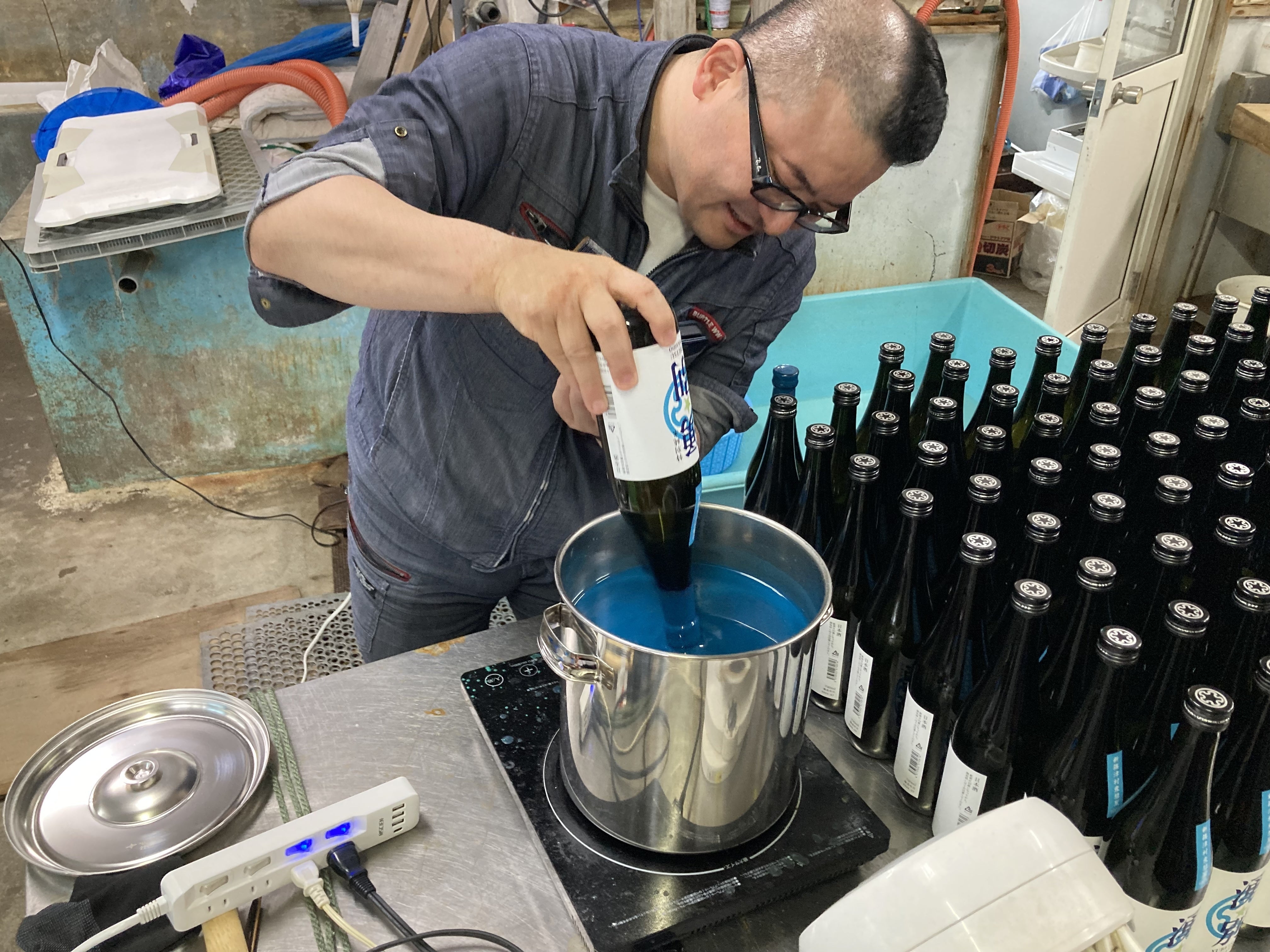 海洋熟成に耐えられるよう1本1本手作業で封蝋していく様子