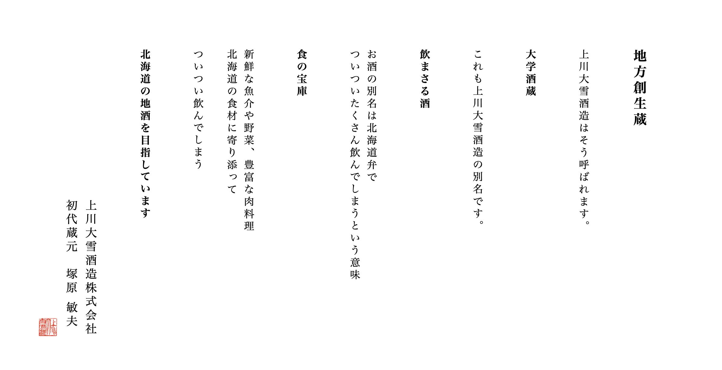 「地域をチカラに。地方創生の挑戦」をスローガンに、2017年、酒蔵を構える上川町の緑丘蔵(りょっきゅうぐら)にて上川大雪酒造としての初めての日本酒が完成しました。以降、「地方創生蔵」として、2020年に帯広市・碧雲蔵(へきうんぐら)、2021年に函館市・五稜乃蔵(ごりょうのくら)と、酒蔵から始まる地方創生に取り組んでいます。