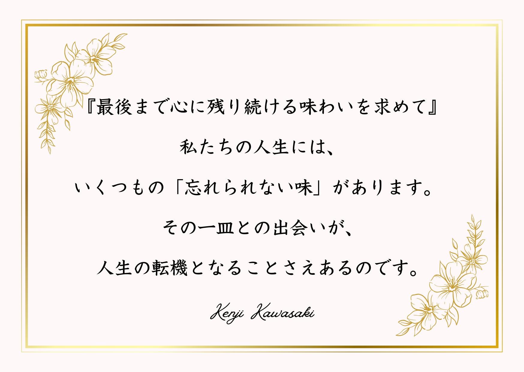 一皿一皿に想いを込め、お客様の記憶に、心に、最後まで残り続けるような体験を提供するレストランとして、必ずや期待に応える空間を創り上げてまいります。