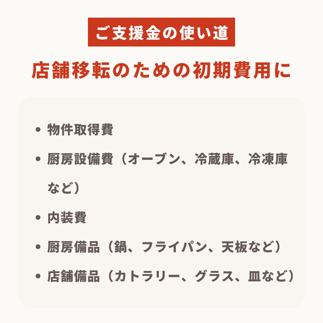 この度の支援金により、料理人としての20年の経験を活かした新たな空間づくりを実現いたします。