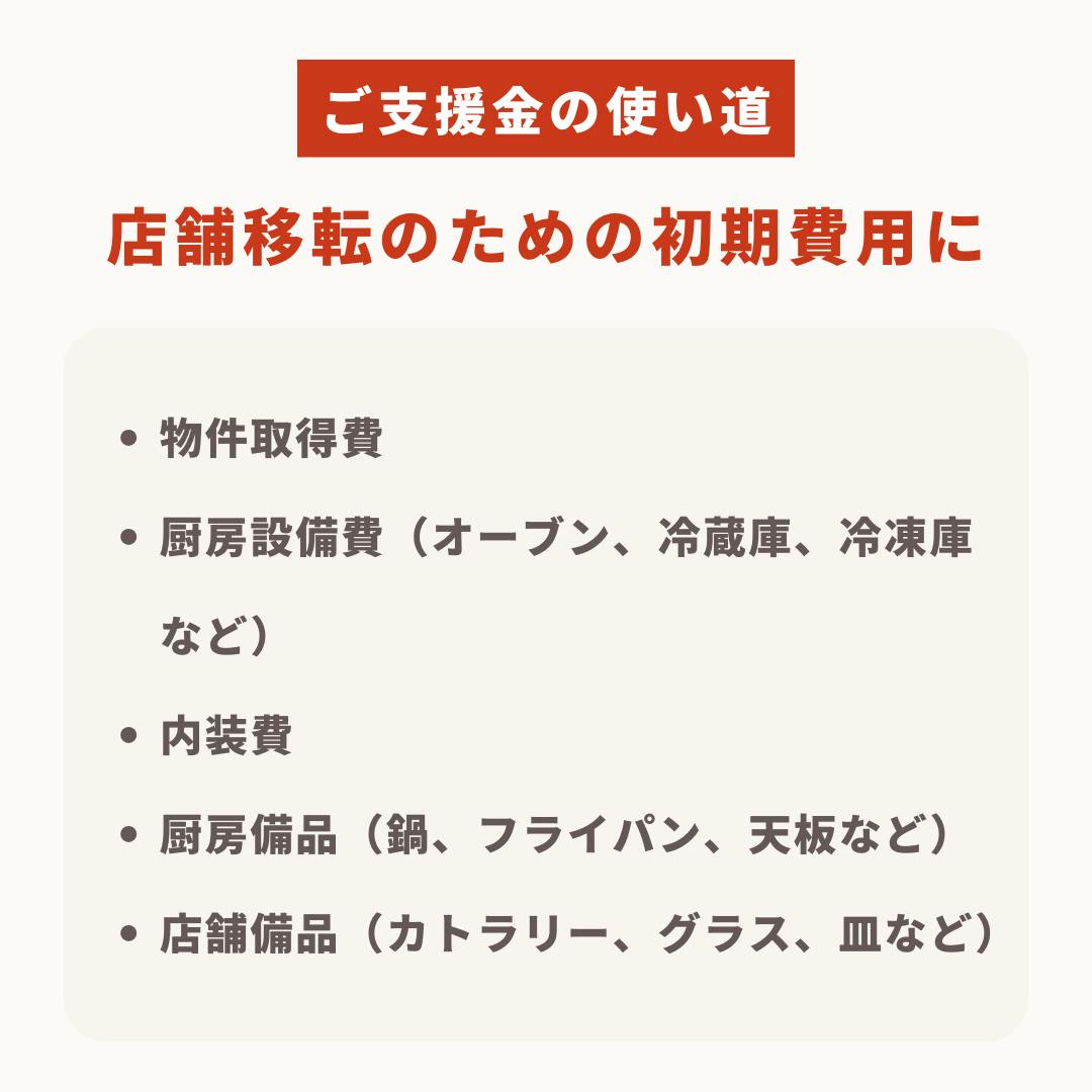 皆さまからのご支援金は、Last Note/ラストノートの店舗移転のための初期費用として大切に使わせて頂きます。