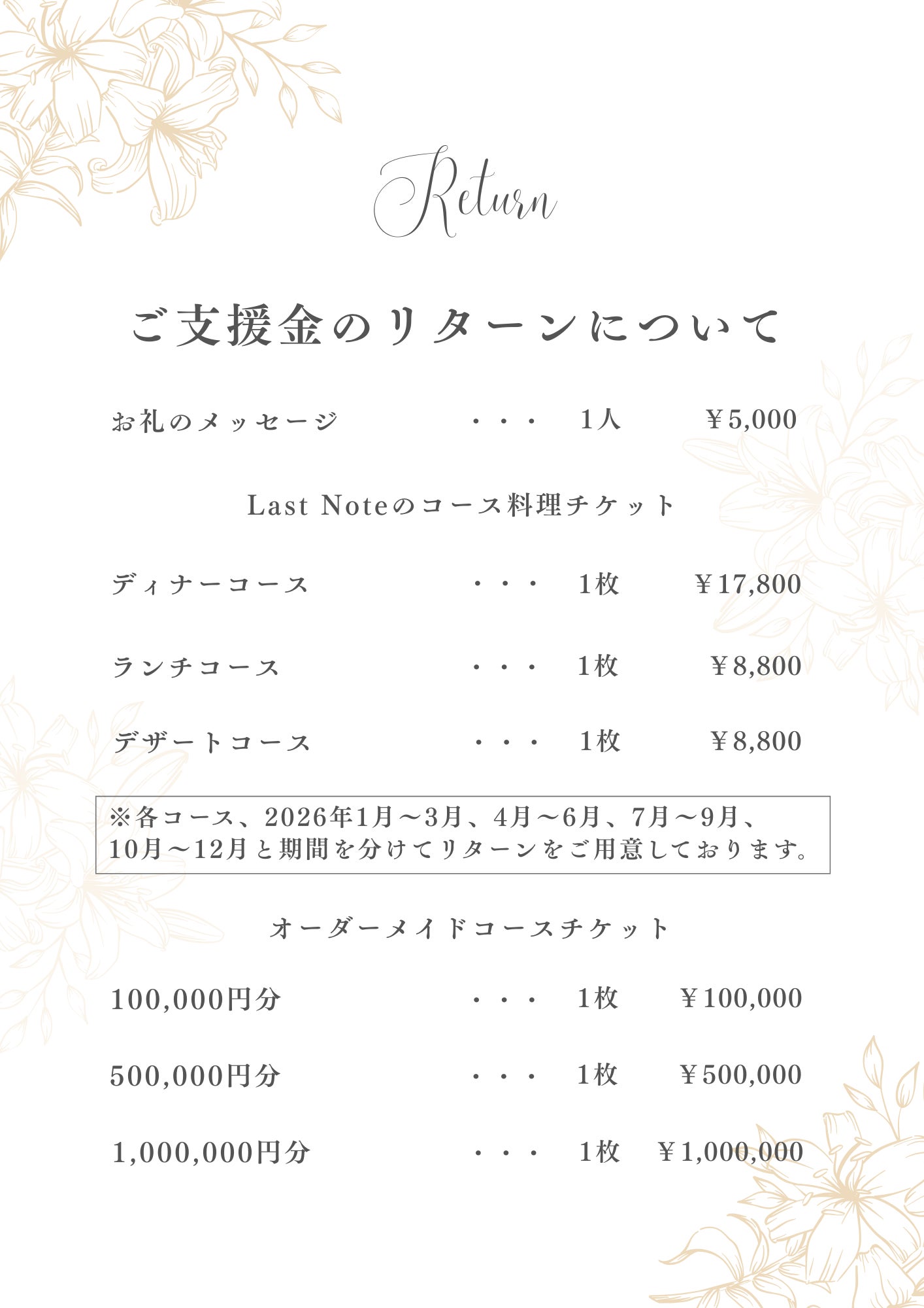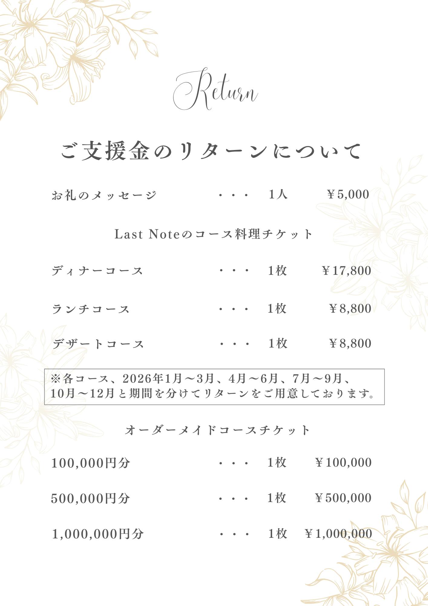 本プロジェクトのリターンは、「Last Note/ラストノート」ならびに私自身が提供できる最大限のお返しを、バラエティ豊かに揃えました。クラウドファンディング限定特価でのご提供です。