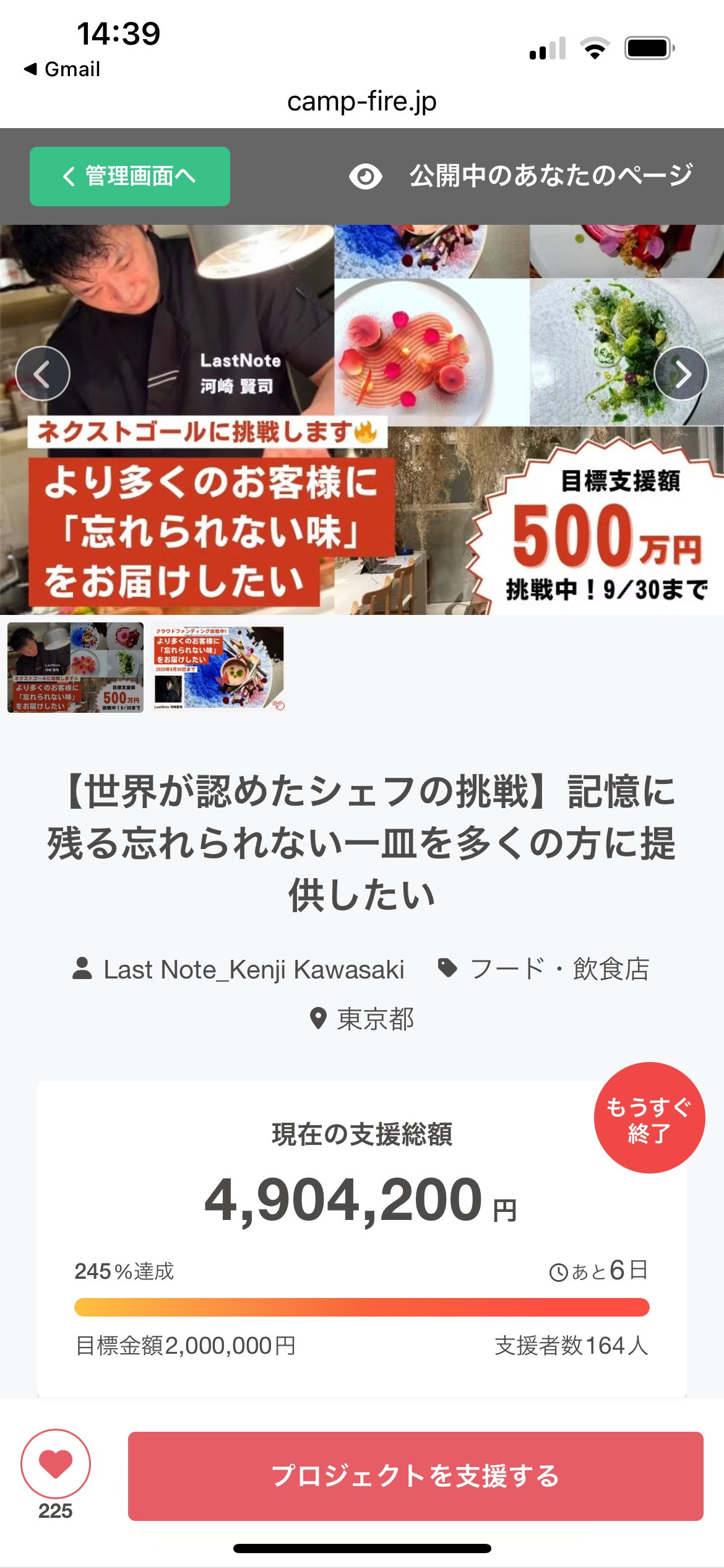 こんなにも早く200万円を達成できるとは思っておらず、驚きとともに、皆様への感謝の気持ちで胸がいっぱいです。CAMPFIREの「フード・飲食店」プロジェクト人気ランキングでも1ページ目に掲載され、多くの方にLast Noteの存在を伝えることができています。重ねて御礼申し上げます。