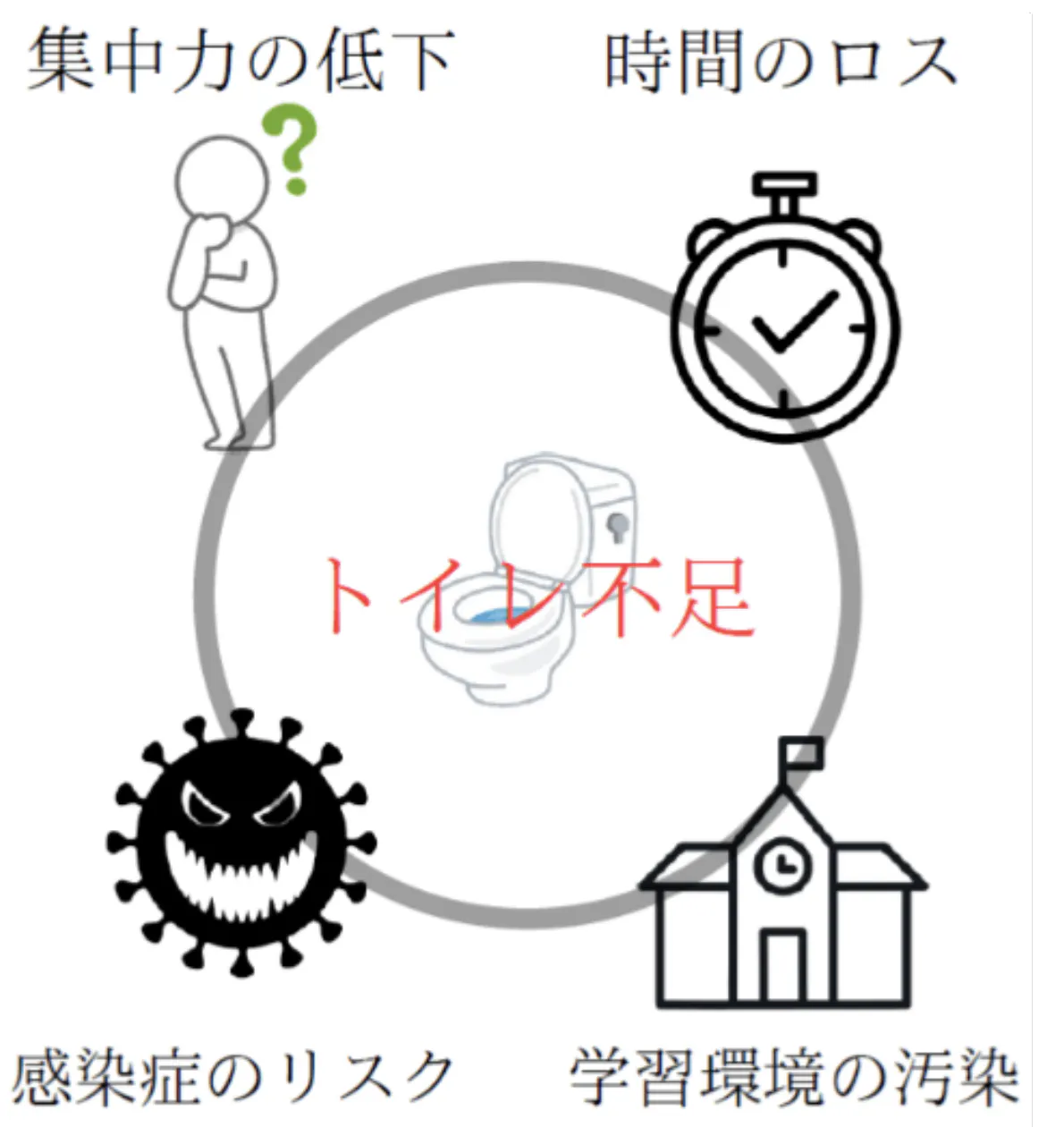 先生方からのご依頼と調査の結果、トイレ不足が深刻な問題であることが明らかとなりました。では具体的にトイレが不足するとどのような課題があるのでしょうか。