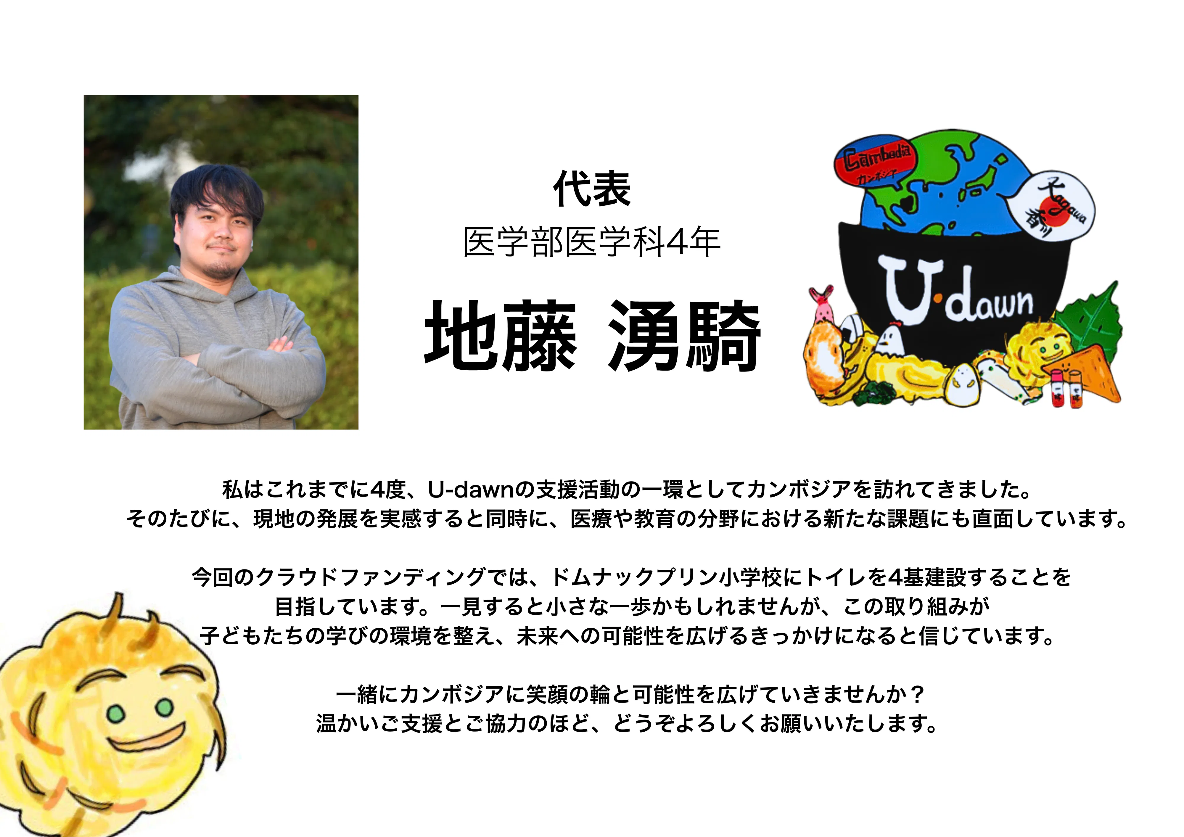 私たちは、香川大学の学生を中心にカンボジアへの支援活動をしている香川国際協力NGO U-dawn(ユードーン)です。
