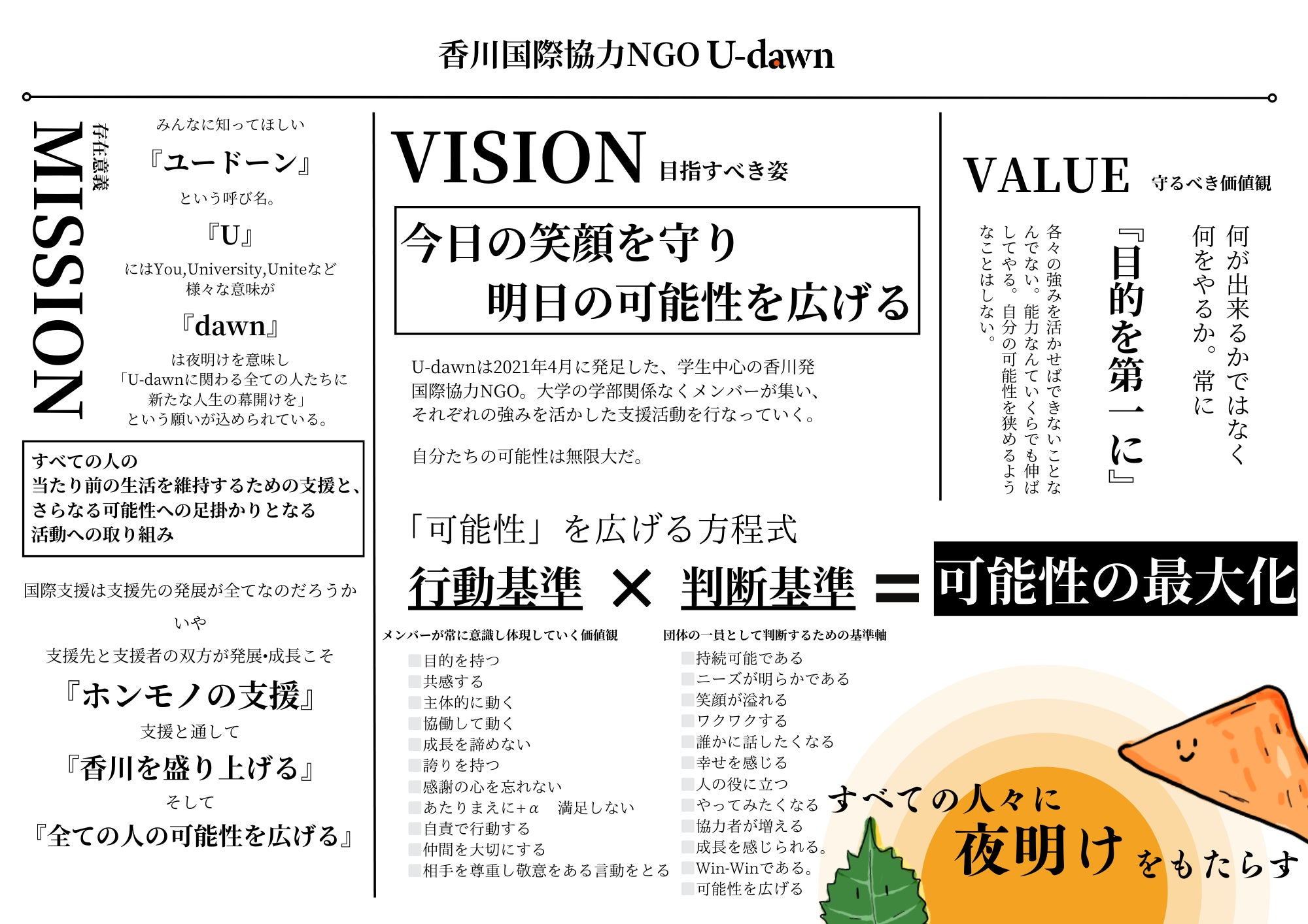 U-dawnの「U」には、YouやUniversity、Uniteなどの様々な意味が、「dawn」は夜明けを意味しています。支援を受ける人々も支援をする私たちも、U-dawnに関わる全ての人たちに人生の新たな幕開けをという思いが込められています。