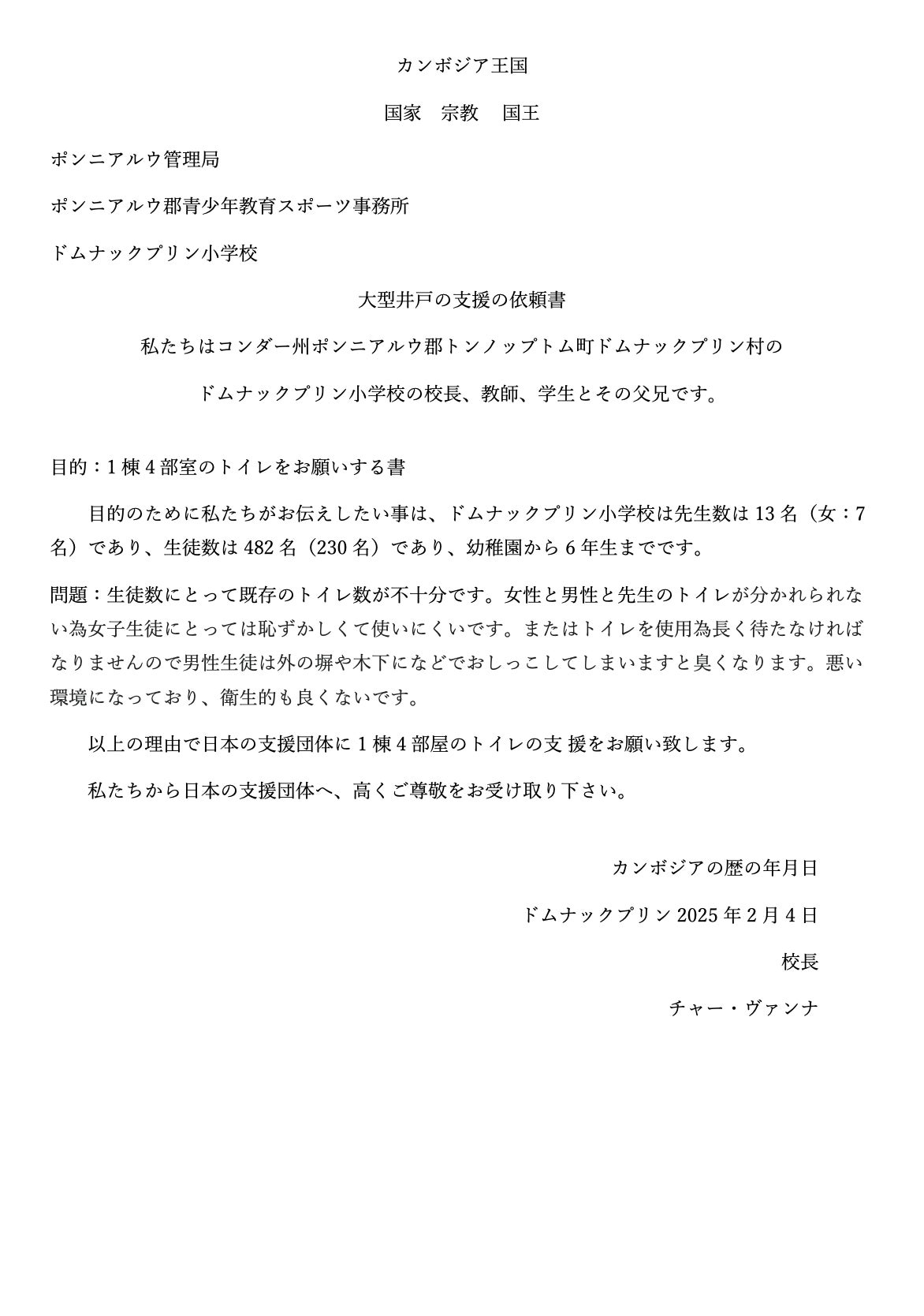今回支援を考えているドムナックプリン小学校の校長先生より、現状の共有と依頼書を正式にいただきました。