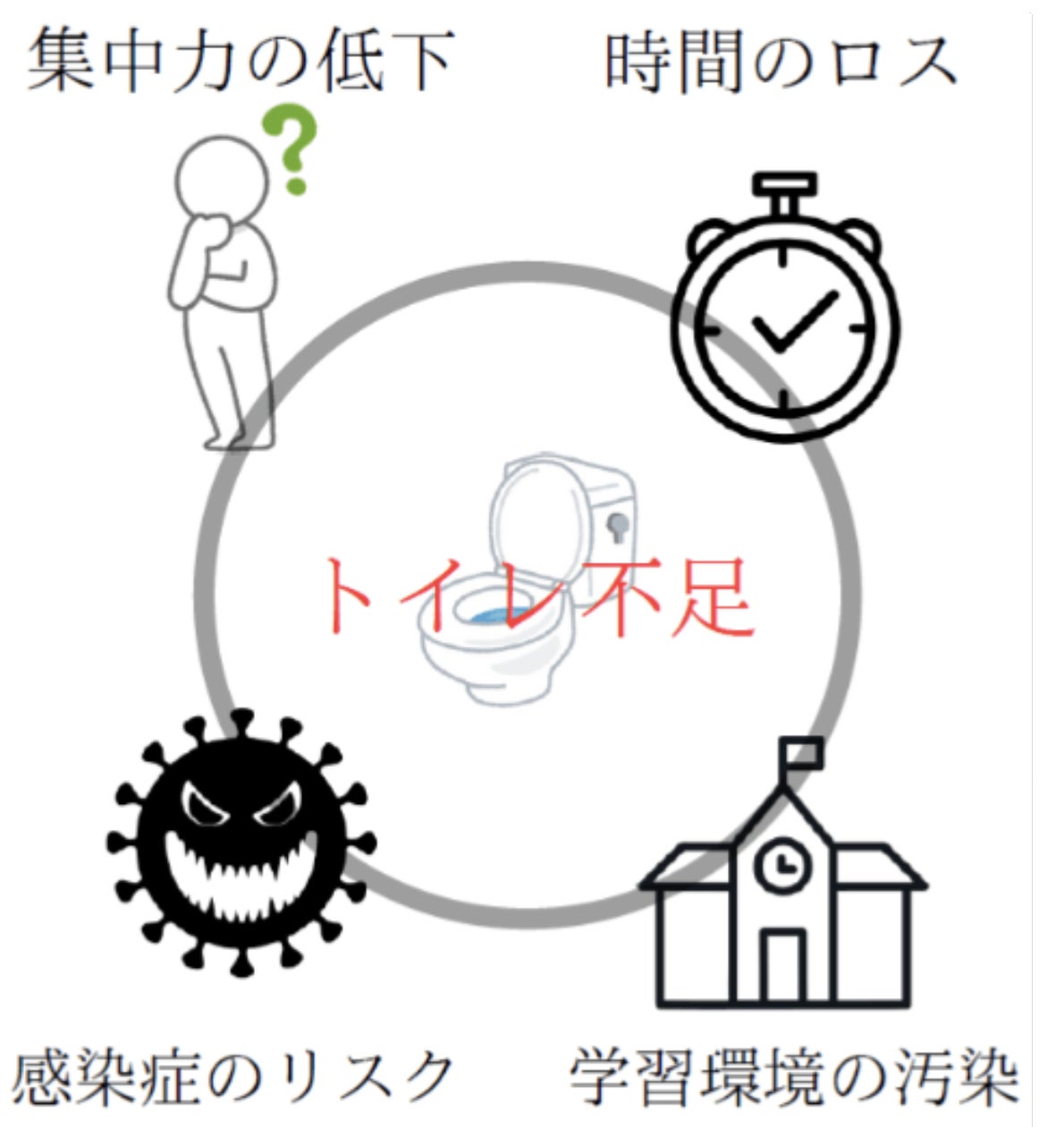 先生方からのご依頼と調査の結果、トイレ不足が深刻な問題であることが明らかとなりました。では具体的にトイレが不足するとどのような課題があるのでしょうか。