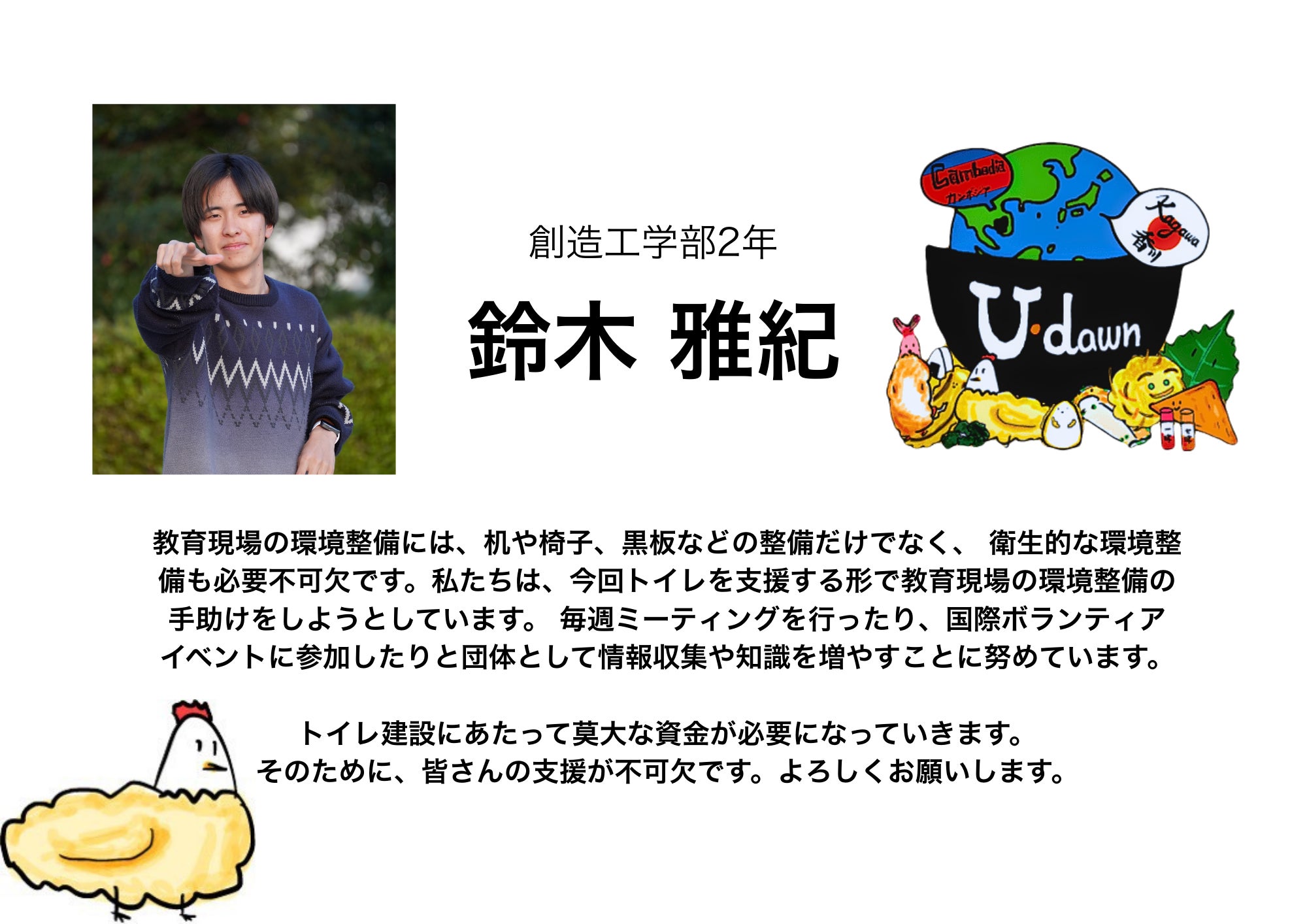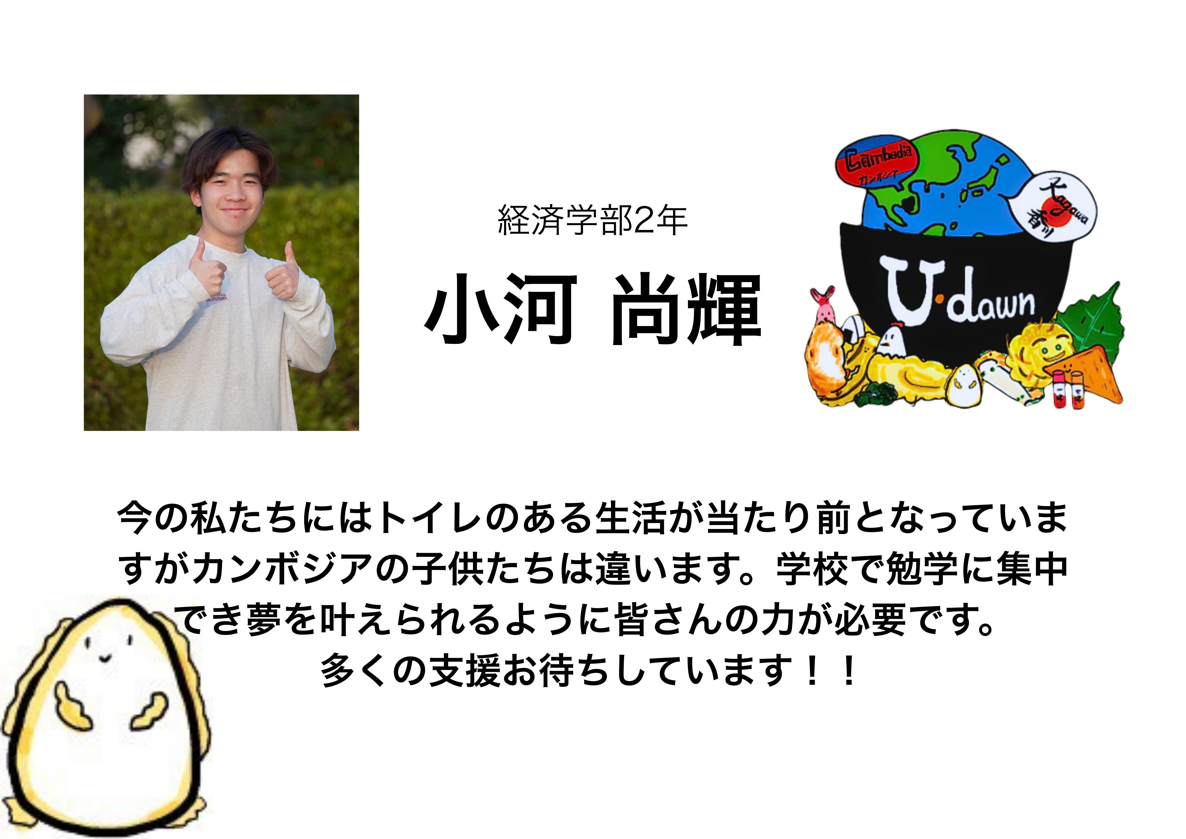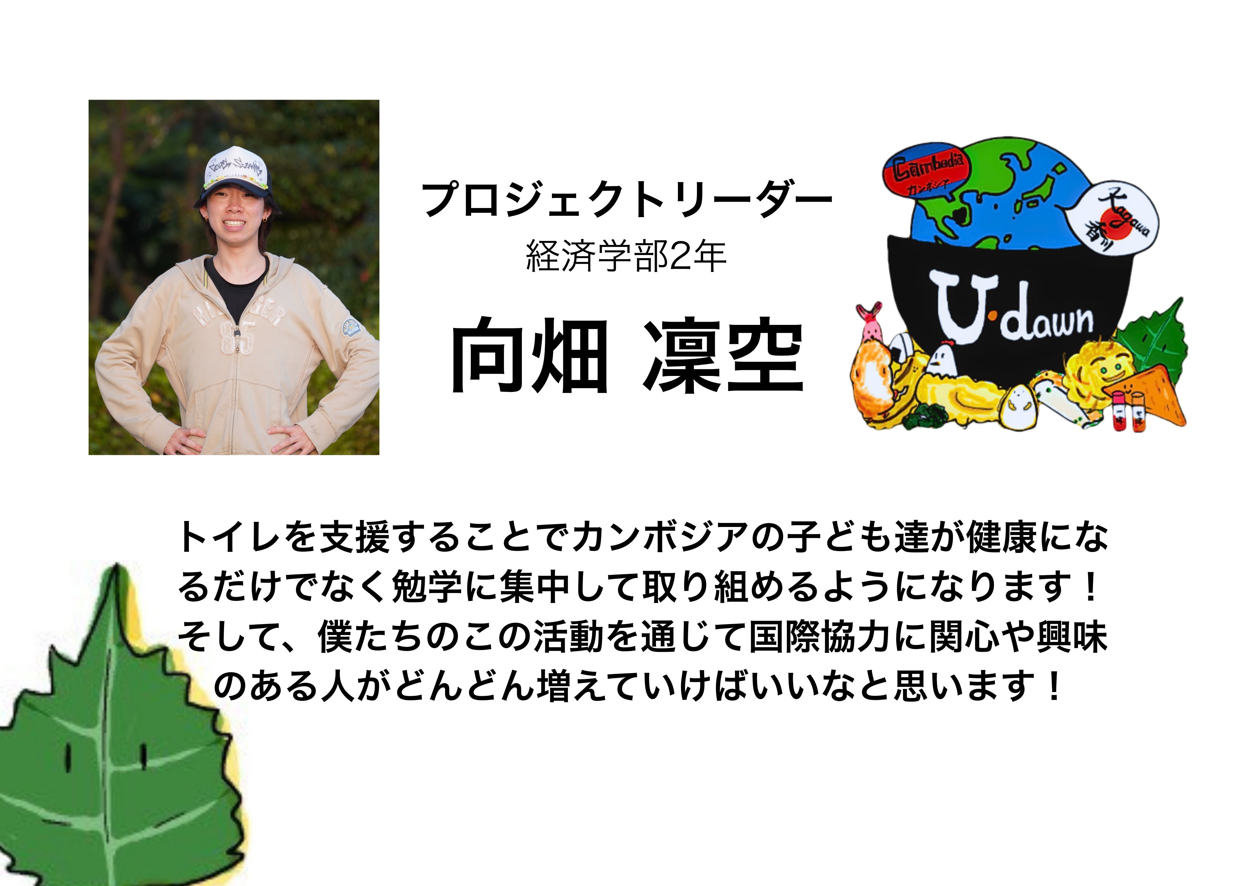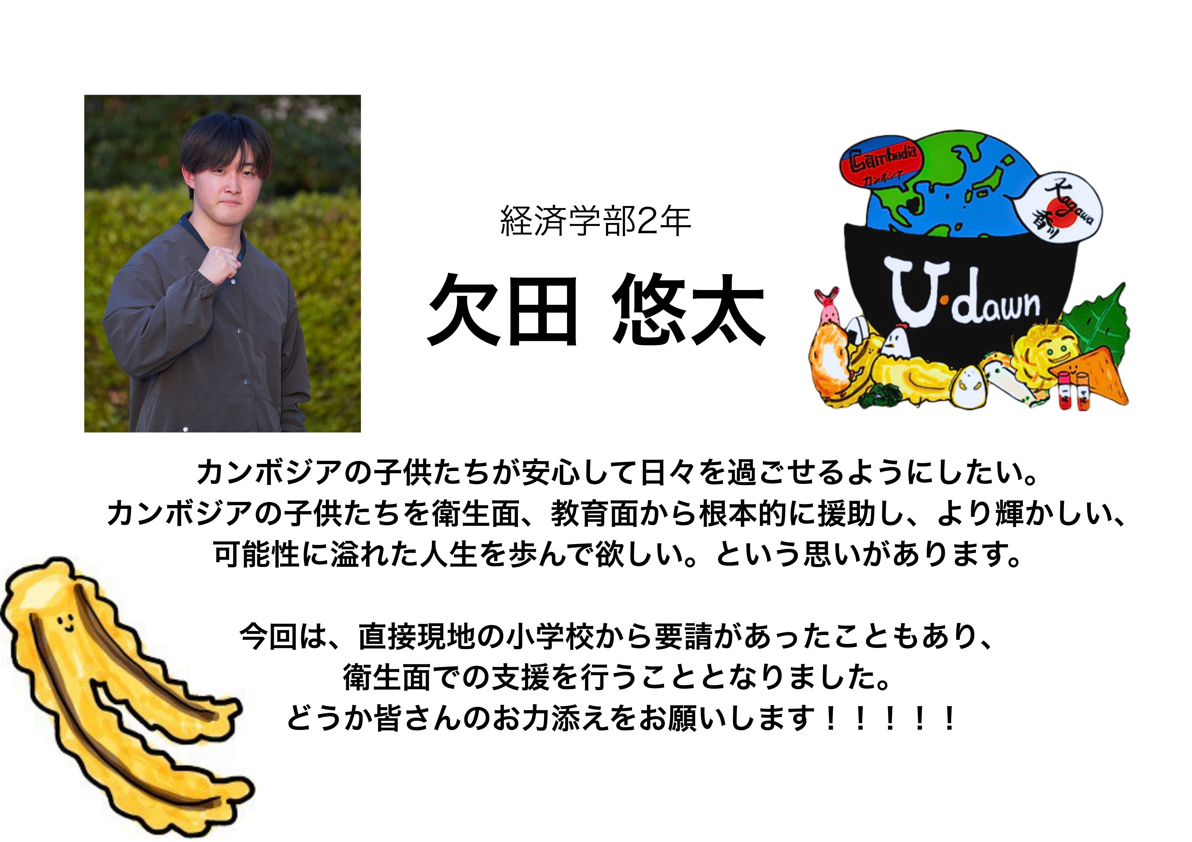 私たちは、香川大学の学生を中心にカンボジアへの支援活動をしている香川国際協力NGO U-dawn(ユードーン)です。