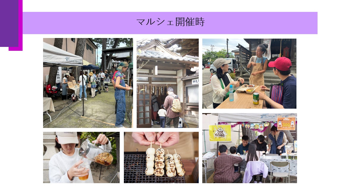 曾祖父の時代から続く団子屋さんのある商店街がこれからも続いていくようにしたいと考えていた時に同じく商店街をよくしたいと考える同級生と街中で偶然に出会い『学校町菅原神社マルシェ』を開催。