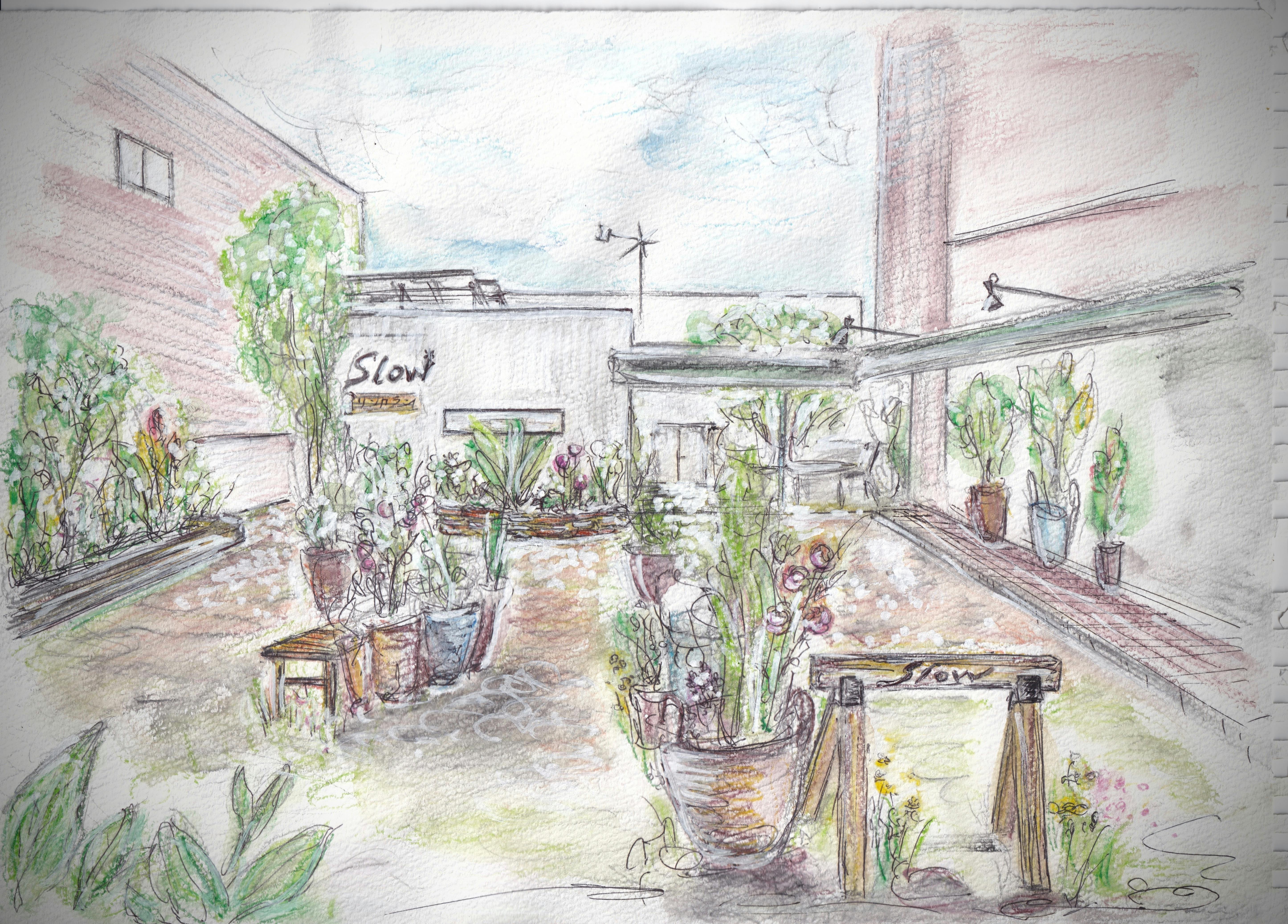 カフェスローを訪れる方が必ず通る中庭と、駐車スペースの空間を緑化して人も生きものも心地よく過ごせる空間を造りたいと考えています。