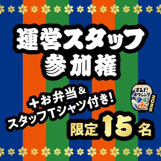 すみだボクシング祭りは多くのボランティアスタッフに支えられています。 そんなイベントを “運営サイド”として体験できる特別な権利 をリターンとしてご用意! 当日スタッフとして参加し、祭りを一緒につくり上げる醍醐味を味わってみませんか? ※スタッフTシャツ、お弁当付き