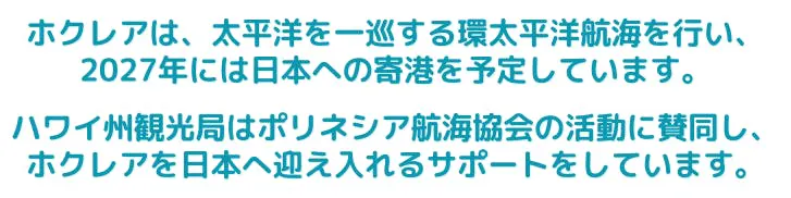 古代航海カヌーの建造や、カヌーのこと、また伝統航海術を通じて「人間が生きるために本当に必要なこと」を学ぶ教育プログラムを日本での受け入れ団体が行い、ホクレアが日本に寄港する日に向けて、ハワイの伝統航海カヌー、「ホクレア」を保有しているポリネシア航海協会との連携を深め、環太平洋を舞台に共同で活動していきます。